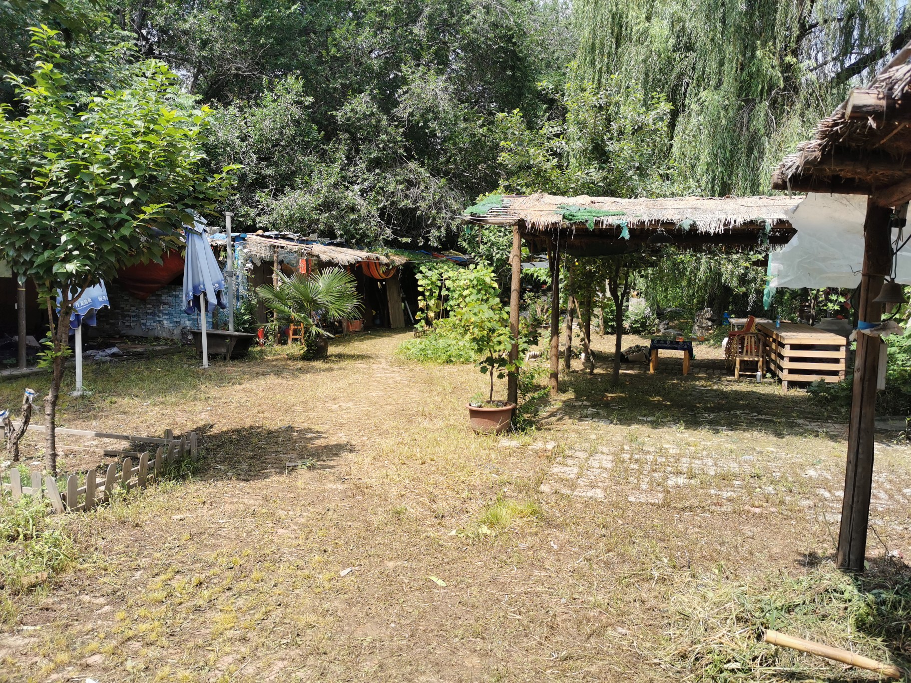院子内,杂草被修剪过,可见桌椅、板凳餐具。