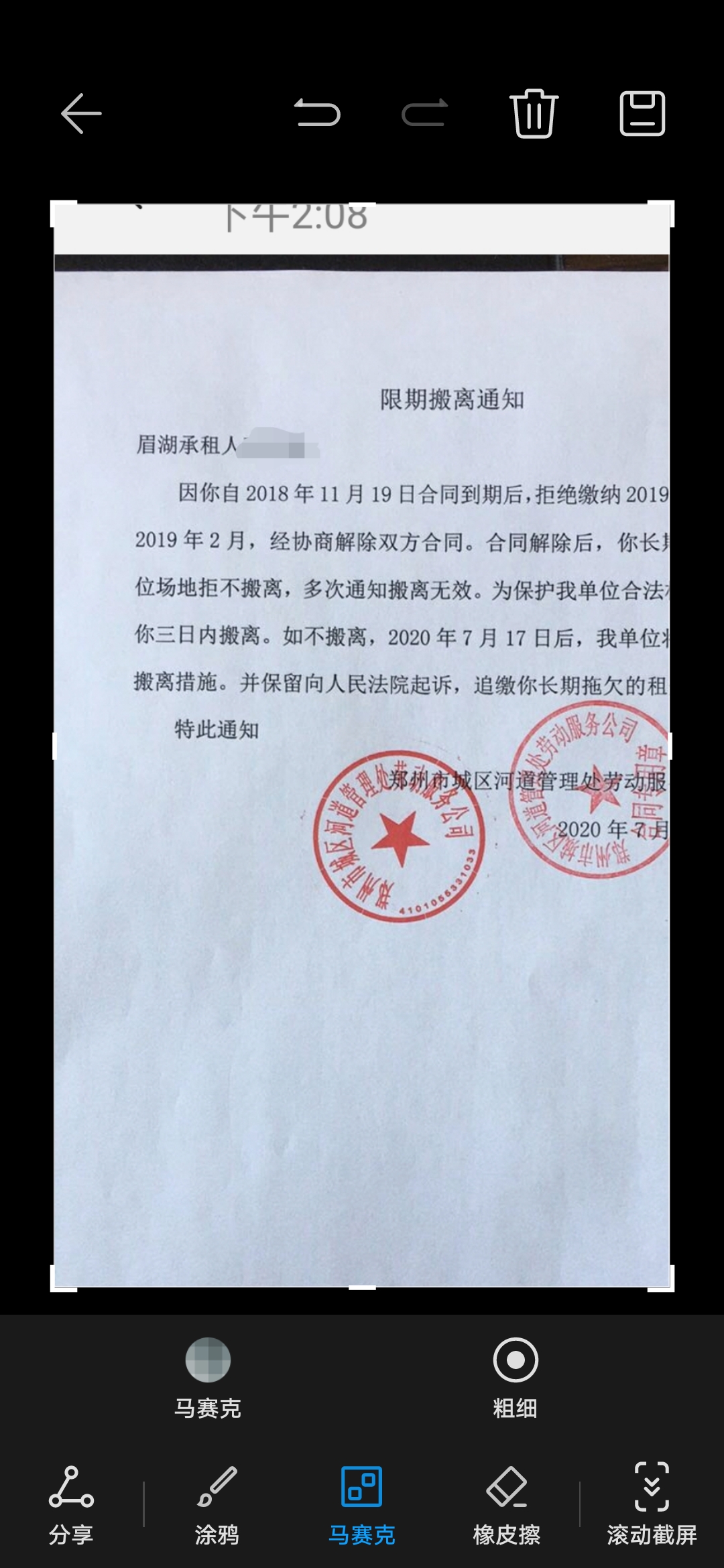 采访中,负责此事的一位男子,出具了一份加盖郑州市城区河道管理处劳务服务公司及合同专用章的“限期搬离通知”显示:眉湖承租人石某,因你自2018年11月19日合同到期后,拒绝缴纳2019年度租金。2019年2月,经协商解除双方合同。合同解除后,你长期占用我单位场地不搬离,多次通知搬离无效。为保护我单位合法权益,责令你三日内搬离。如不搬离,2020年7月17日以后,我单位将采取强制搬离措施。并保留向人民法院起诉,追缴你长期拖欠的租金。