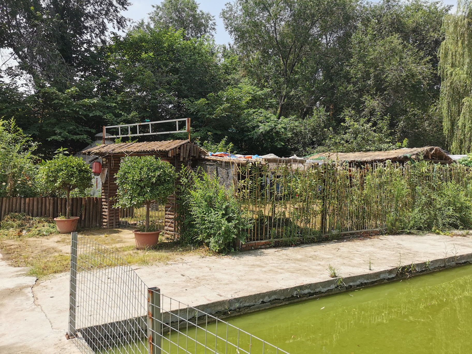 沿简易板房向东,可见金水河南侧眉湖空白区域,大约500平方米区域内,里面设置了蒙古包、简易茶台、几间草屋等,其北面临湖,周围用竹竿围挡。