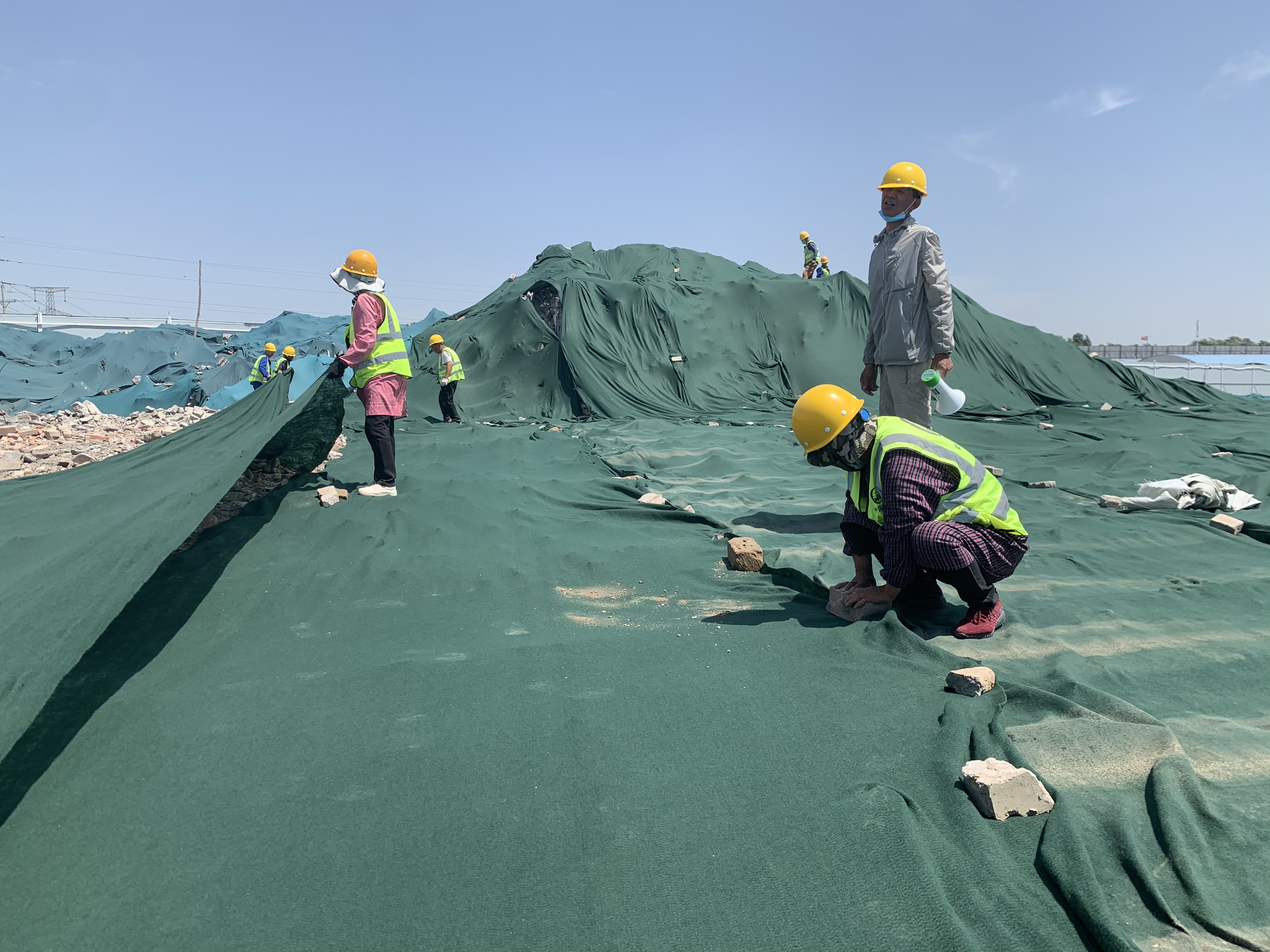 据介绍,项目部为了避免扬尘,剩余的建筑垃圾也全披上了“绿衣”。站在高处远眺,虽然风较大,但偌大的工地几乎感受到不到扬尘。