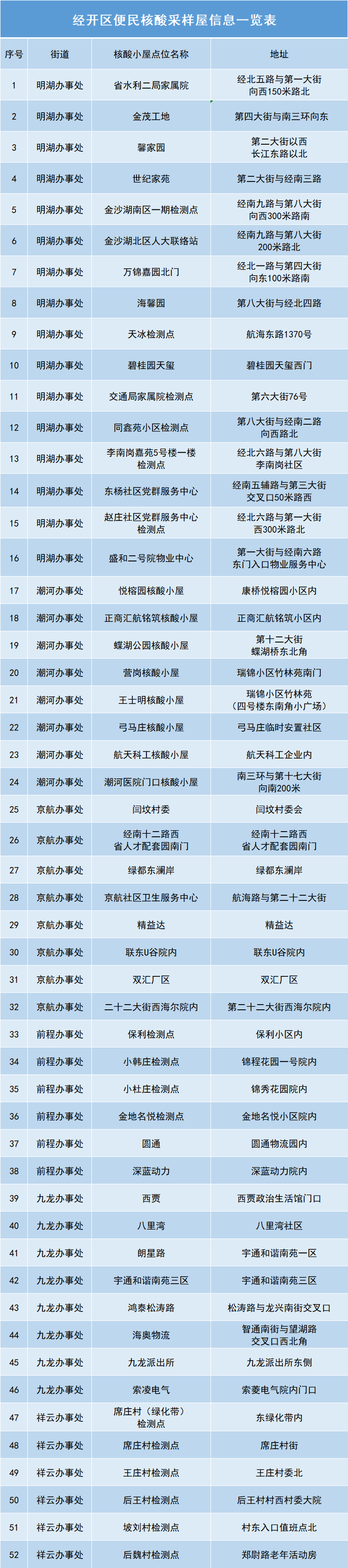 为保障有核酸检测需求的群众得到安全、便捷、有序的核酸采样服务,现将经开区各办事处开放的便民核酸采样屋公布如下,请有相关需求的群众科学安排时间,错峰、错时、就近前往采样。