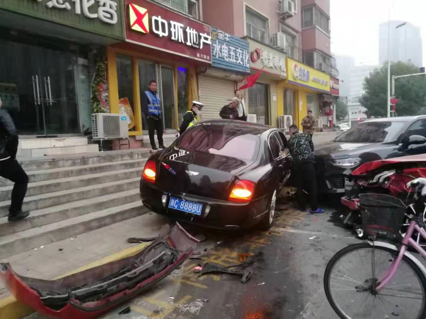 10月21日,一辆黑色宾利轿车在金水区福元路上行驶,突然撞向停靠在路边的两辆车,之后顶着被撞车辆冲向了街边门店。车内三个人中有一女子受伤被送往医院。交警表示事故系驾驶员疲劳驾驶所致。