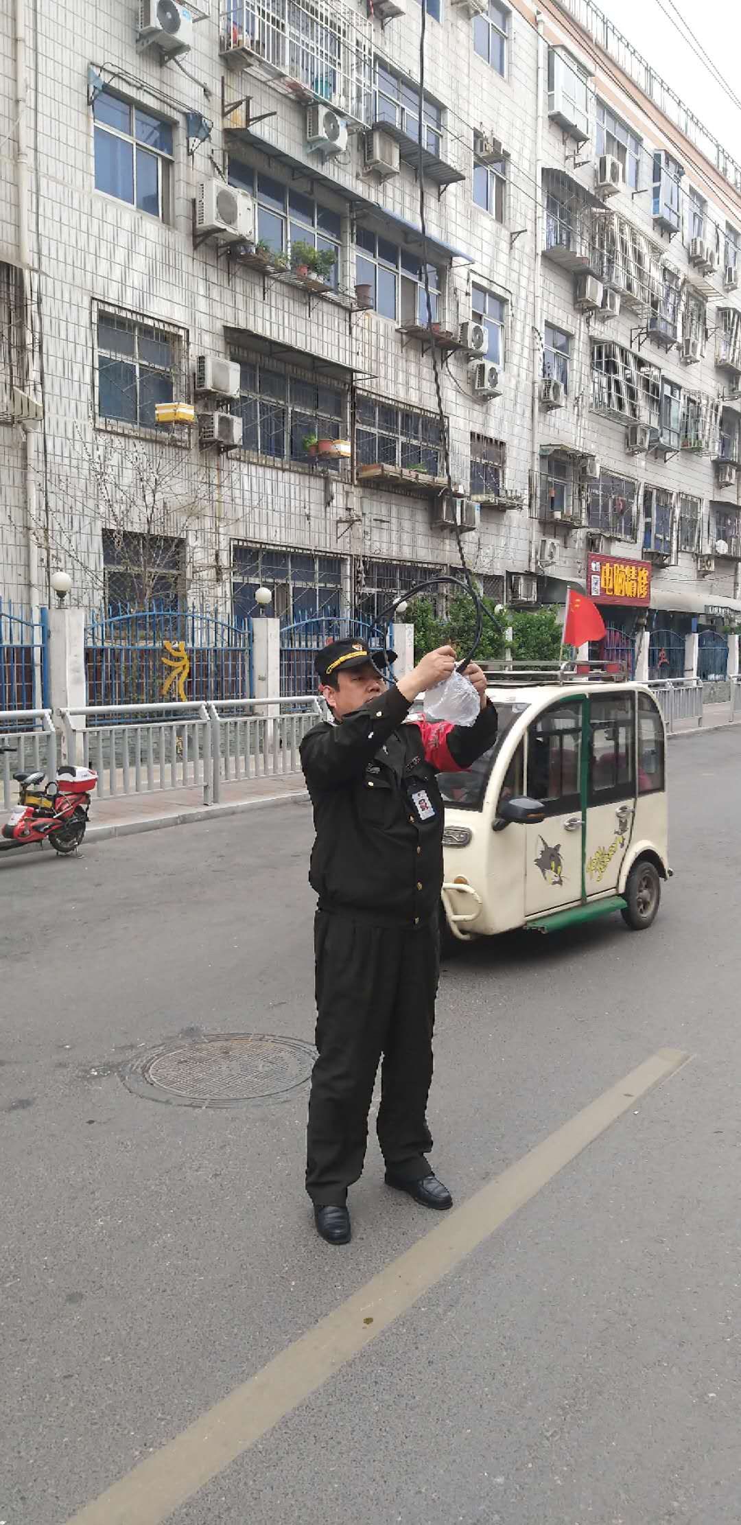 此时,巡防队员刘建伟和队友一边找来工具托举线缆,一边指挥车辆小心通过,一边联系街道办事处城管队员前来增援。