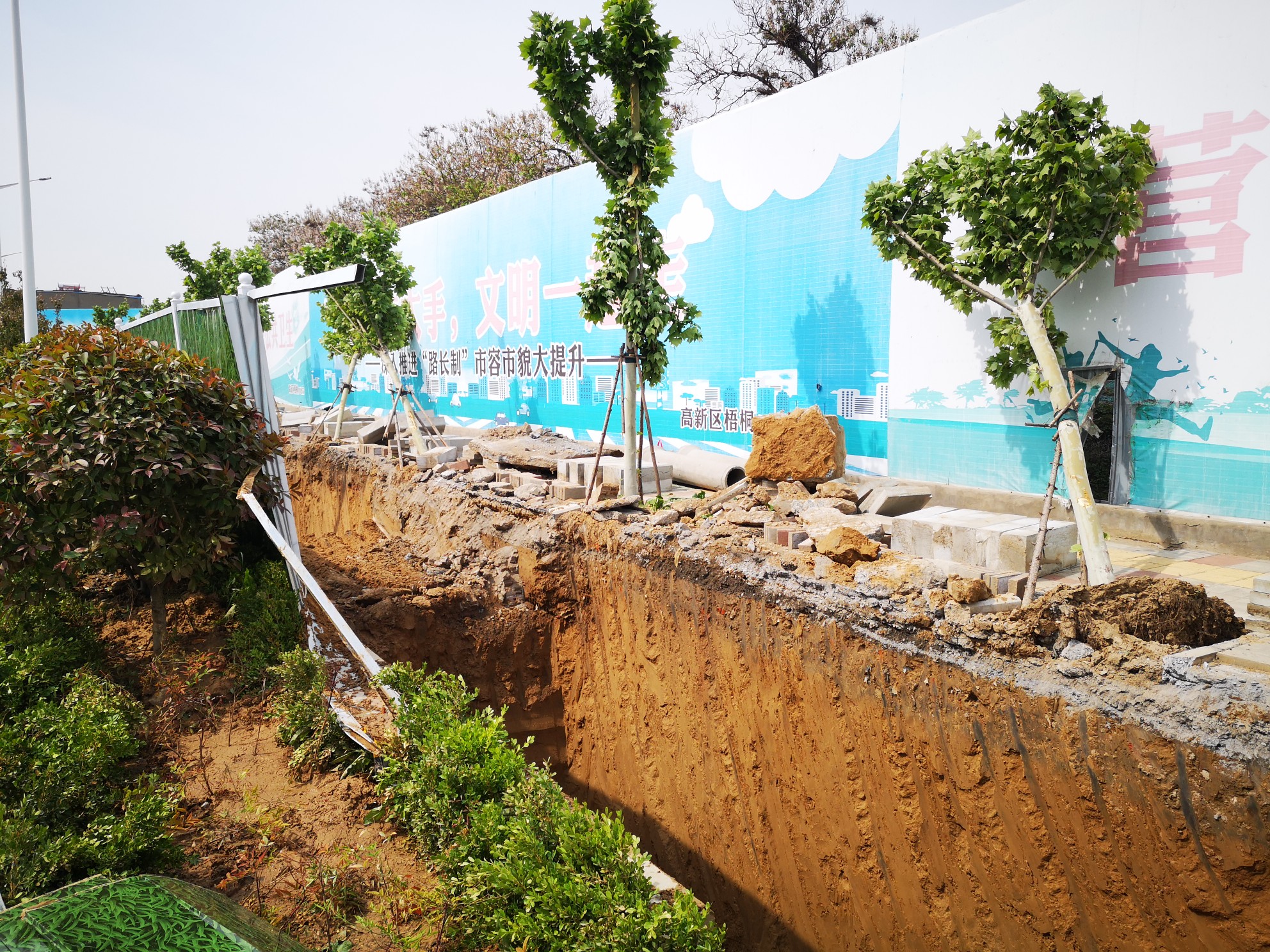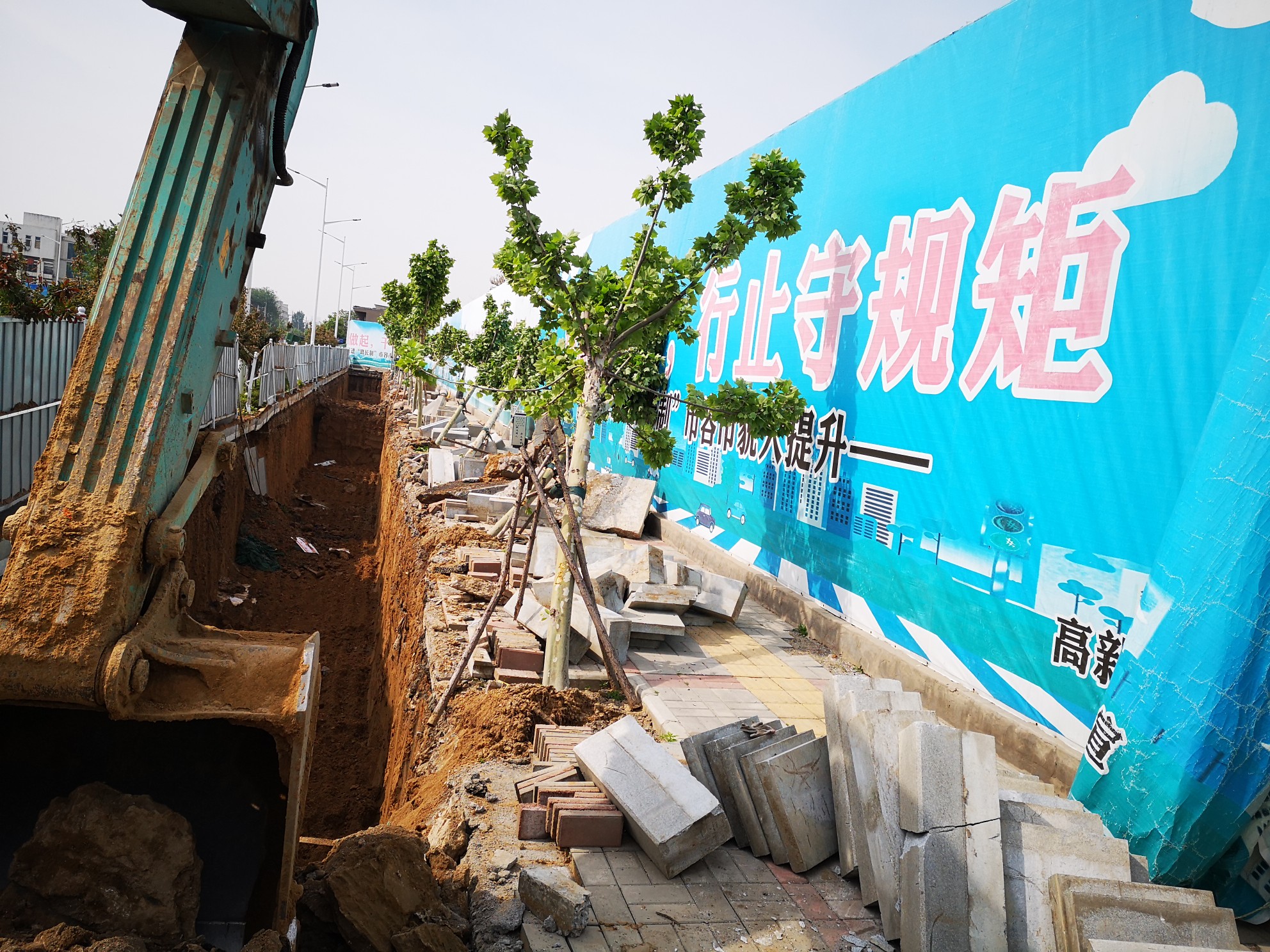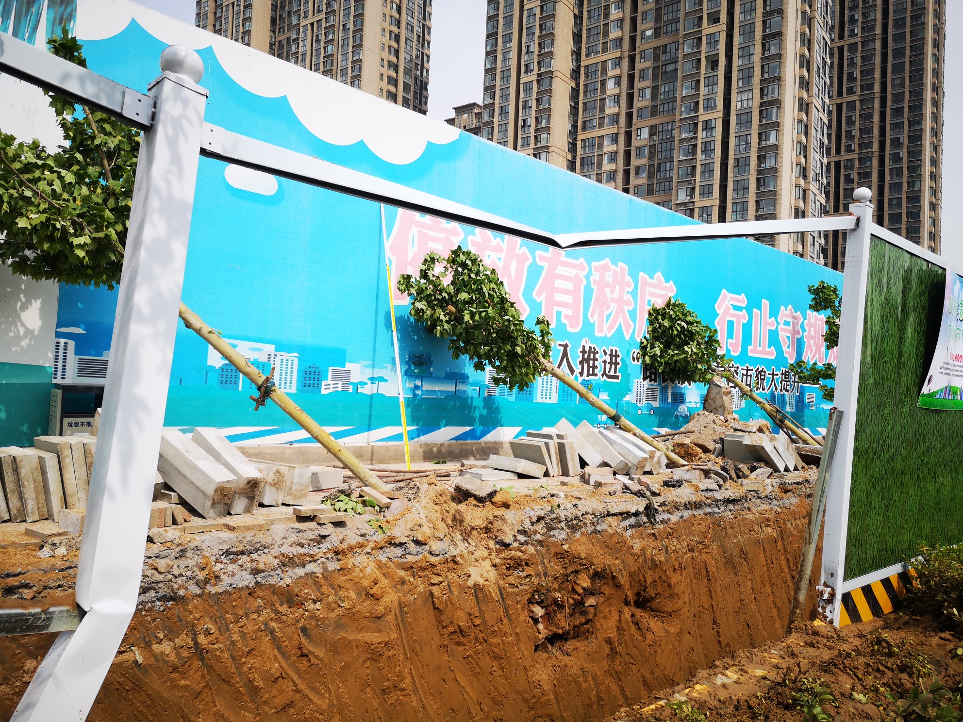 当天上午,记者赶到了市民所反映情况的路段,在雪松路和药厂街交叉口往南,雪松路的西侧路边,围挡里面施工现场,停放一辆挖掘机,一条深沟西侧,倾倒着多棵行道树,有的根部凸起,搭在围挡上。不过,未见有工人作业。