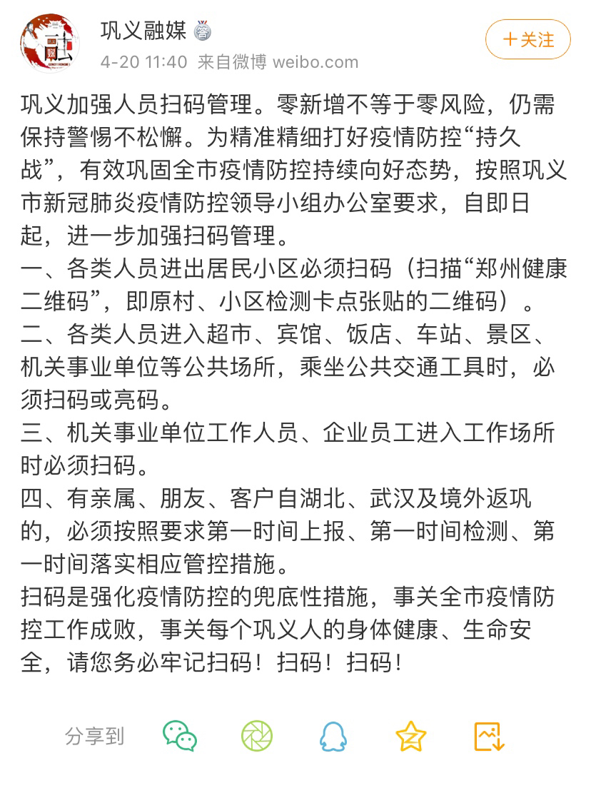 此前,网传巩义市发布通知,没有居家隔离的小区可以不扫码进出。对此,巩义市4月19日发出了最新提醒,按照巩义市新冠肺炎疫情防控领导小组办公室要求,自即日起,进一步加强扫码管理。各类人员进出居民小区必须扫码(扫描“郑州健康二维码”,即原村、小区检测卡点张贴的二维码);各类人员进入超市、宾馆、饭店、车站、景区、机关事业单位等公共场所,乘坐公共交通工具时,必须扫码或亮码;机关事业单位工作人员、企业员工进入工作场所时必须扫码。
