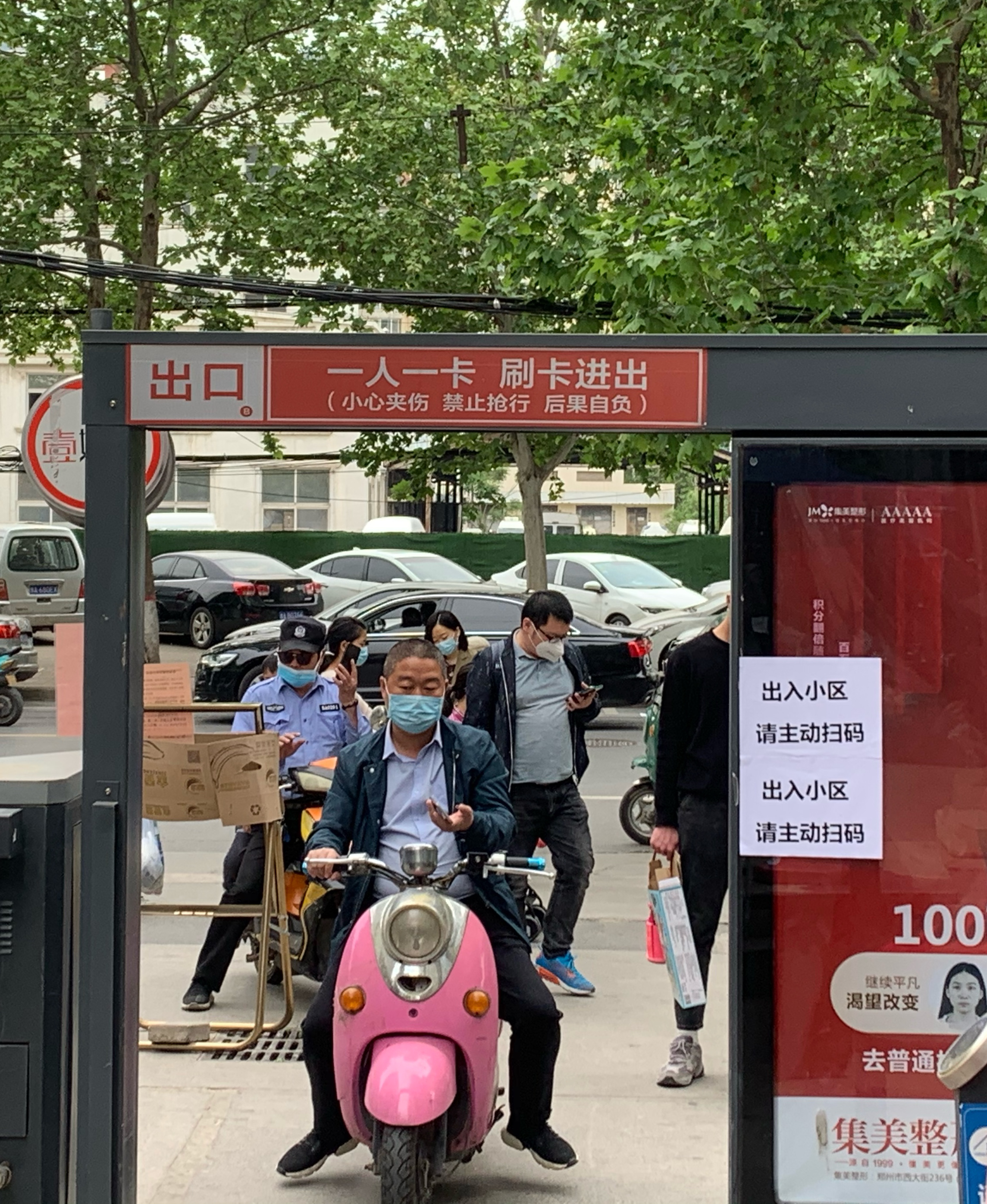 21日下午,郑州市一小区门口,小区居民扫码进门