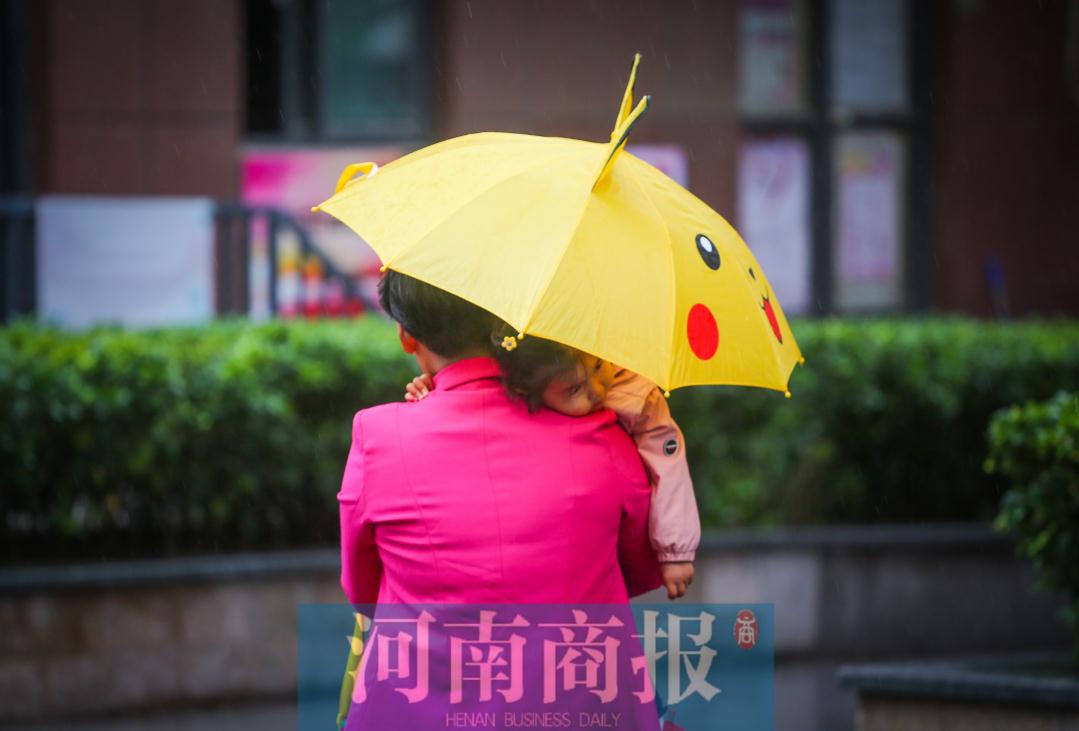 2019年10月9日,河南省郑州市经开第八大街与经北四路,一位女士抱着小孩,打着一把画有卡通玩偶的雨伞,像珍珠一样晶莹剔透的雨滴从伞沿滴下。