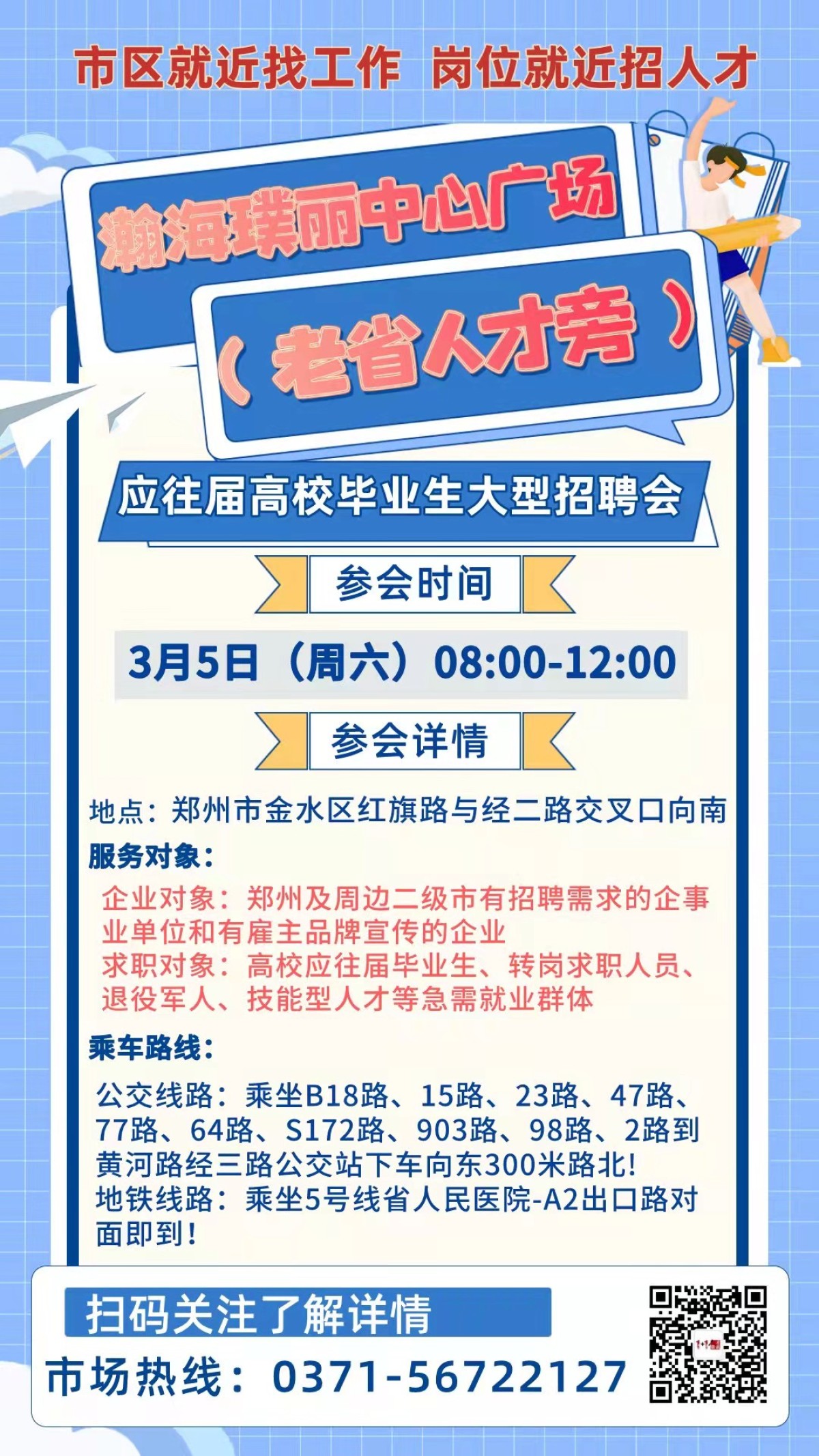 天气渐暖,“金三银四”的求职季又到啦!3月1日,记者从河南123人才网获悉,3月5日(周六)上午,为进一步促进高校毕业生青年人才就业创业工作的开展,持续推动常态化郑州市“上门服务•进社区•灵活就业”招聘会活动。此次由共青团郑州市委、金水区人力资源和社会保障局、丰产路街道办事处联合河南123人才网举办,主题为“2022郑州市高校毕业生青年人才大型招聘会”活动将于3月5日(周六)在郑州瀚海璞丽中心广场(老省人才旁)举办,届时200多家知名企业参会,提供23600余个岗位。