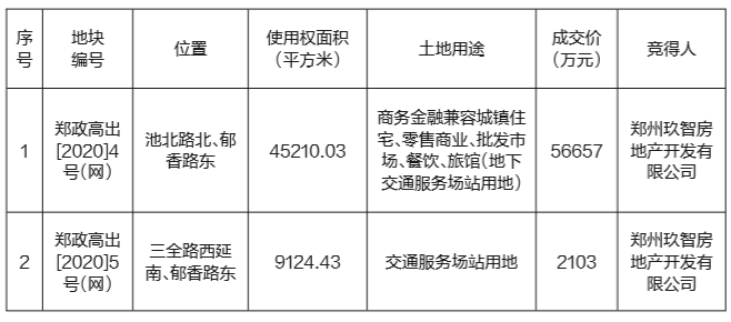 5月26日,郑州市公共资源交易中心发布郑政高出 [2020]4 号(网)、郑政高出 [2020]5 号(网)两宗国有建设用地使用权挂牌出让结果公示 。