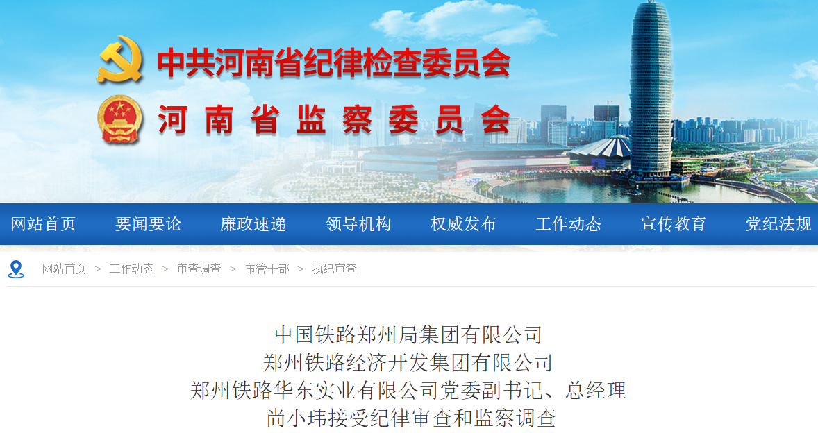 郑州铁路华东实业党委副书记、总经理尚小玮被审查调查