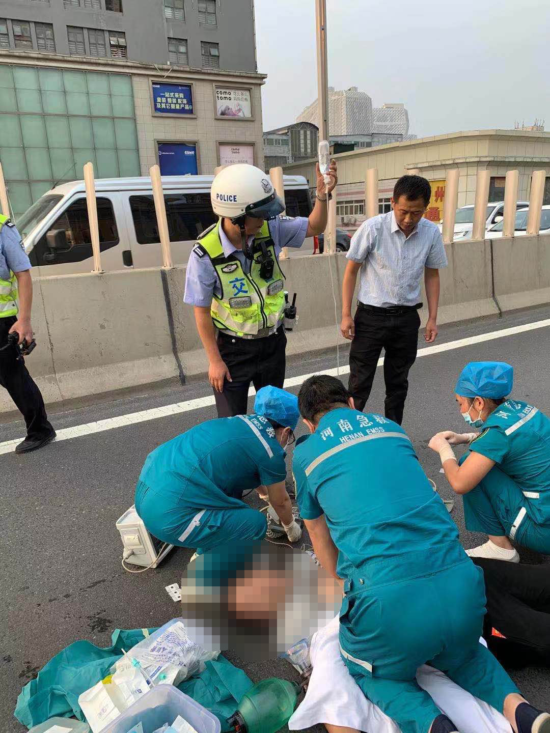 2020年6月30日18时分许,正值市区交通流量高峰,郑州交警三大队铁骑队员马京浩在陇海高架(京广路——一马路)路段巡逻途中发现一出租车停靠在高架桥西向东方向道路中央,立即停车查明情况发现该车辆驾驶员趴在方向盘上,处于昏迷状态。出租车乘客告诉铁骑队员他已经拨打了120急救电话,马京浩立即将该情况上报大队指挥室,同时与120急救车辆再次联系告知其具体位置。