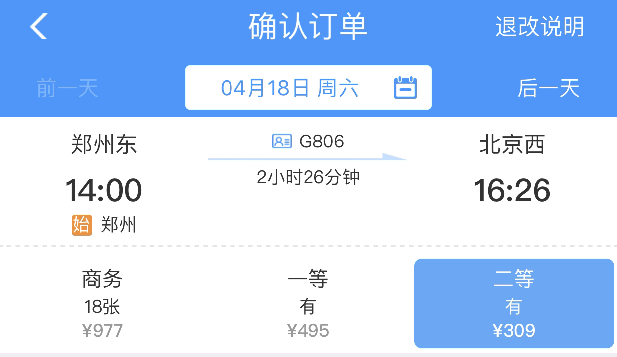 既然“复兴号”有这么多优点,那它的票价会不会比普通高铁高一些?记者查询12306了解到,这趟郑州东直达北京西的G806次“复兴号”列车,二等座价格为309元,与之前动车组相比完全一致,一等座和商务座票价分别为495元和977元,与之前也没有差别。