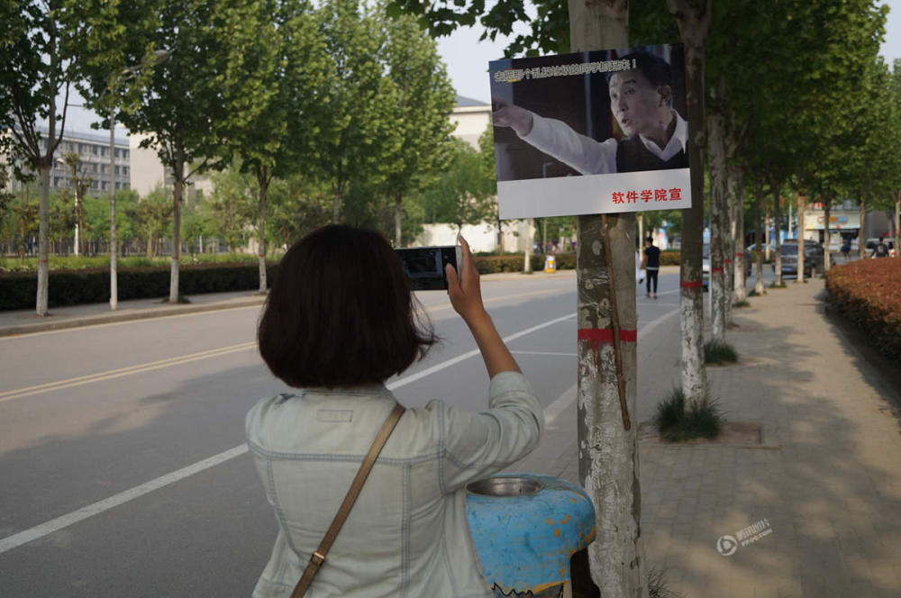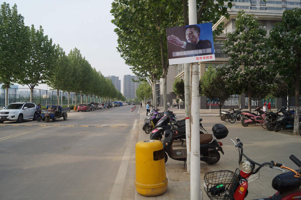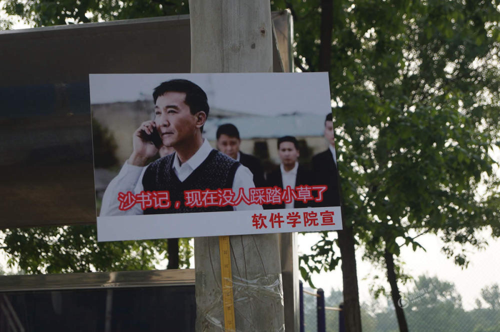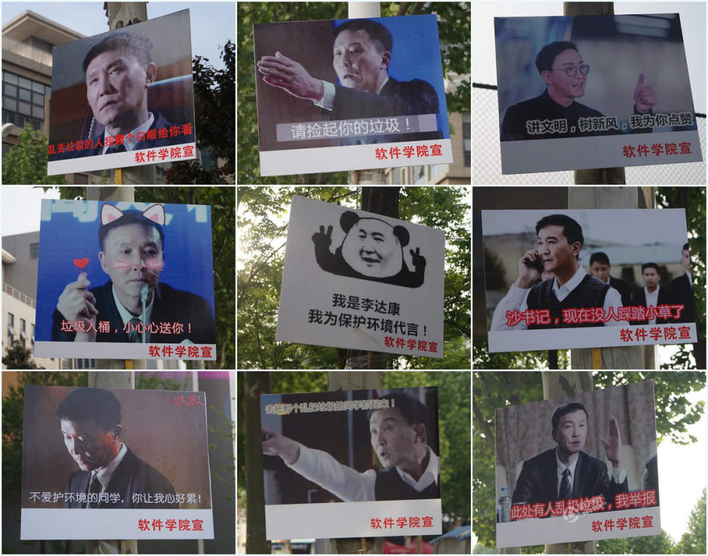 2017年4月24日,郑州,河南牧业经济学院校园内随处可见“达康书记”表情包标牌。电视剧《人民的名义》中爆红的李达康书记在标牌上“比小心心”、“要亲亲”,卖萌严肃两手抓,宣传保护校园环境。左冬辰/视觉中国