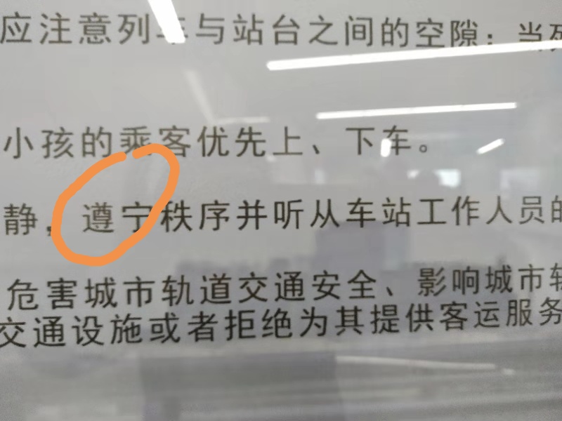 郑州市地铁2号线二期站内,乘客守则有错别字,遵守写成了“遵宁”。1月30日,大河报•大河客户端独家报道并反映给郑州地铁客服。很快,郑州地铁做出反应,立即进行临时纠正。稍后,还会进行统一更换。