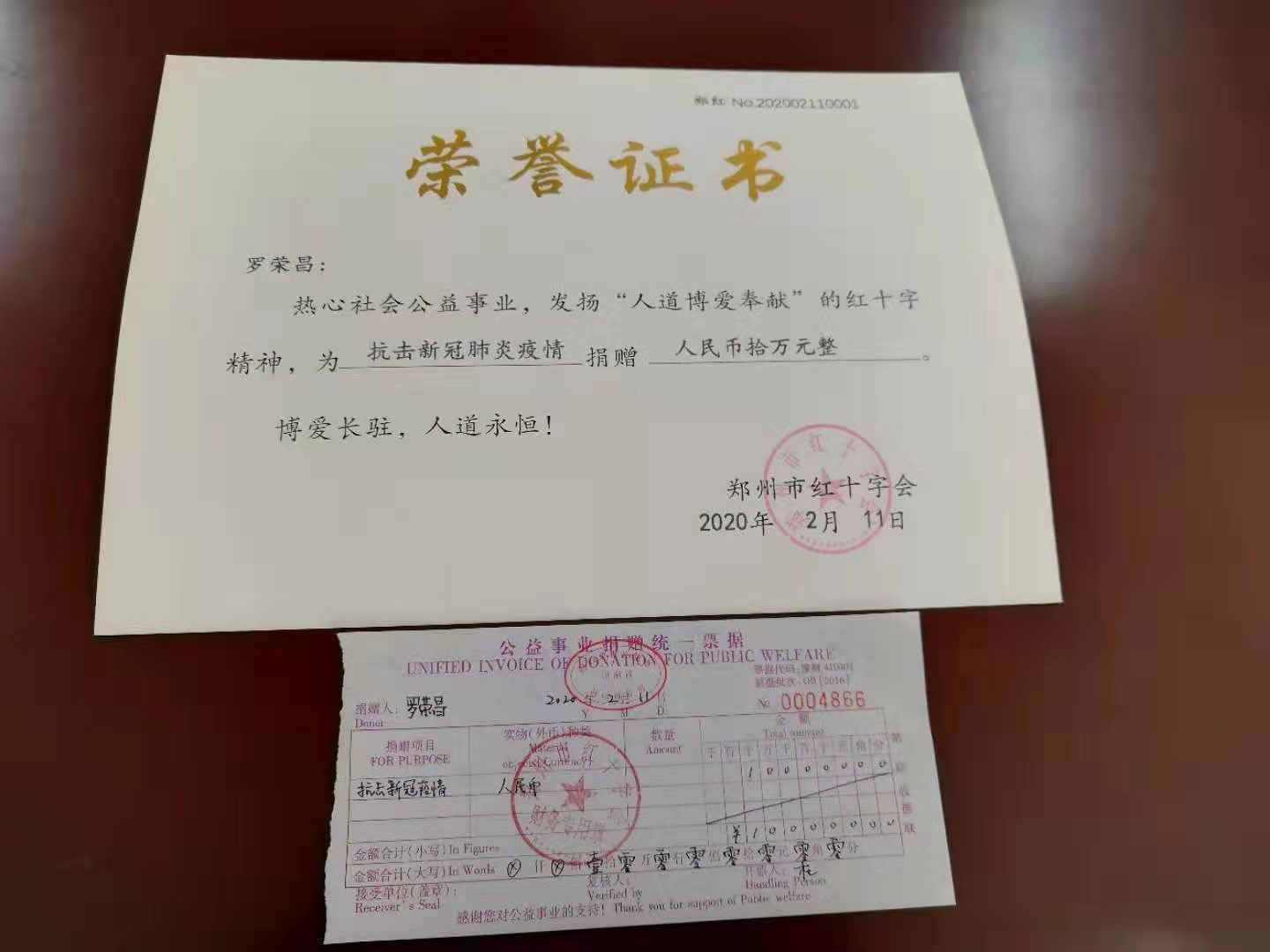 2月11日上午,郑州市88岁的离休老干部罗荣昌以个人名义通过郑州市红十字会捐款10万元,用于郑州市抗击新冠病毒疫情防控工作。据悉,这是河南省红十字系统向社会公布接收疫情防控捐赠方式以来,收到的个人单笔最高捐款。