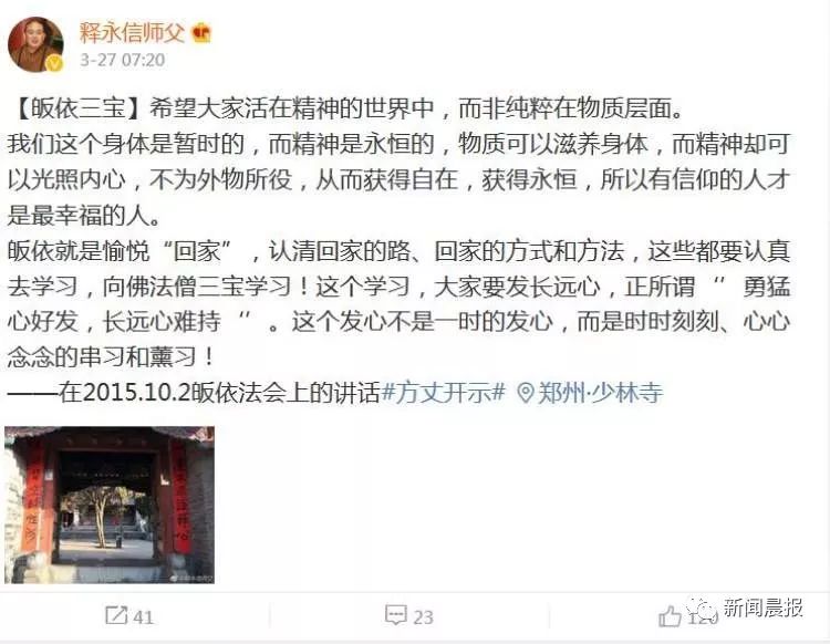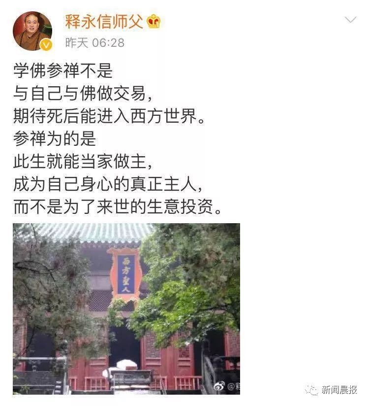 少林寺方丈释永信开微博 网友:怎么看佛系青年?