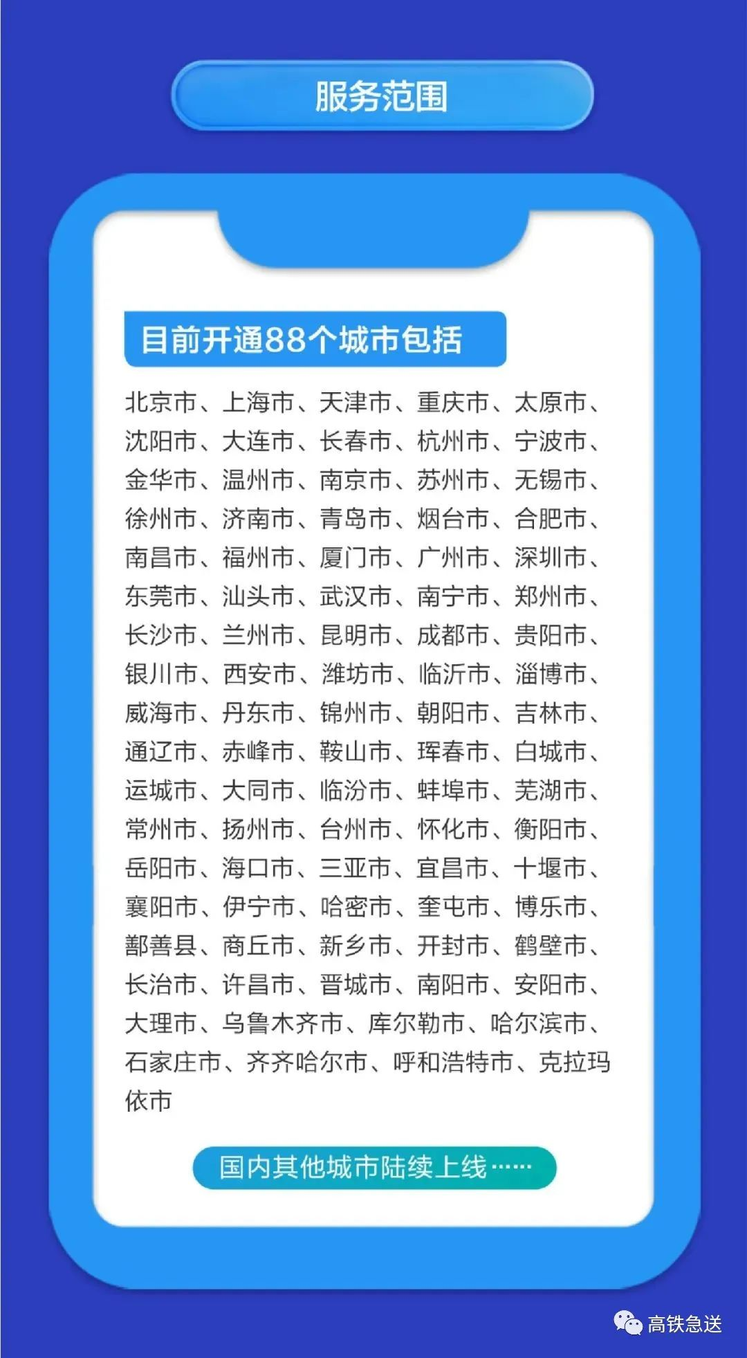 目前,全国开通“高铁急送”服务的县市有88个,高铁车站有100个,共覆盖全国4个直辖市、25个省会城市、54个地级市、5个其他县市。