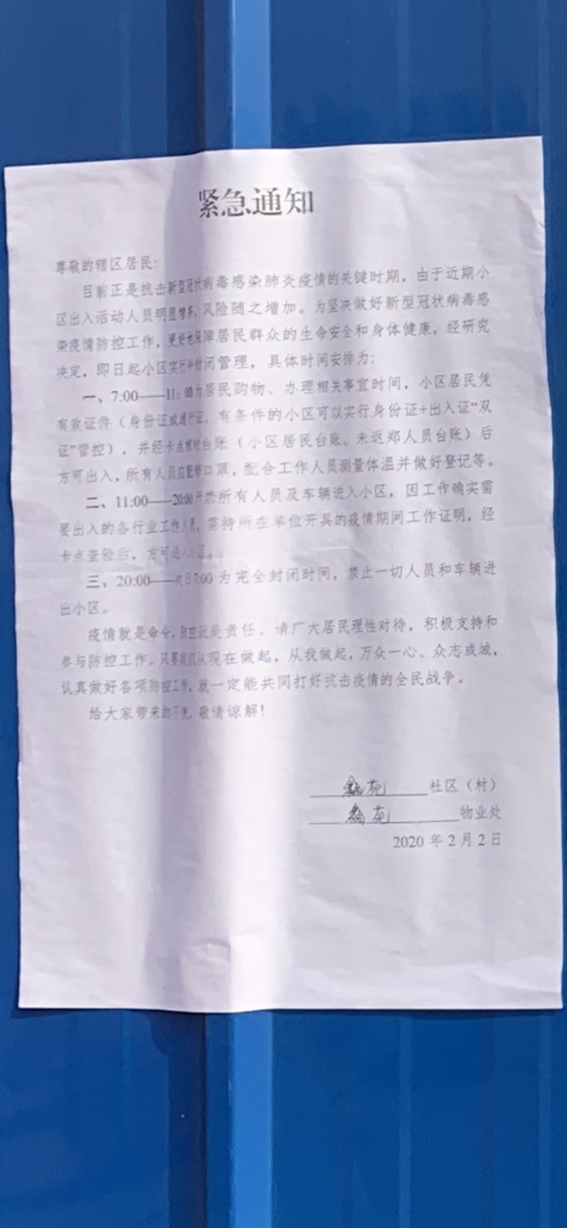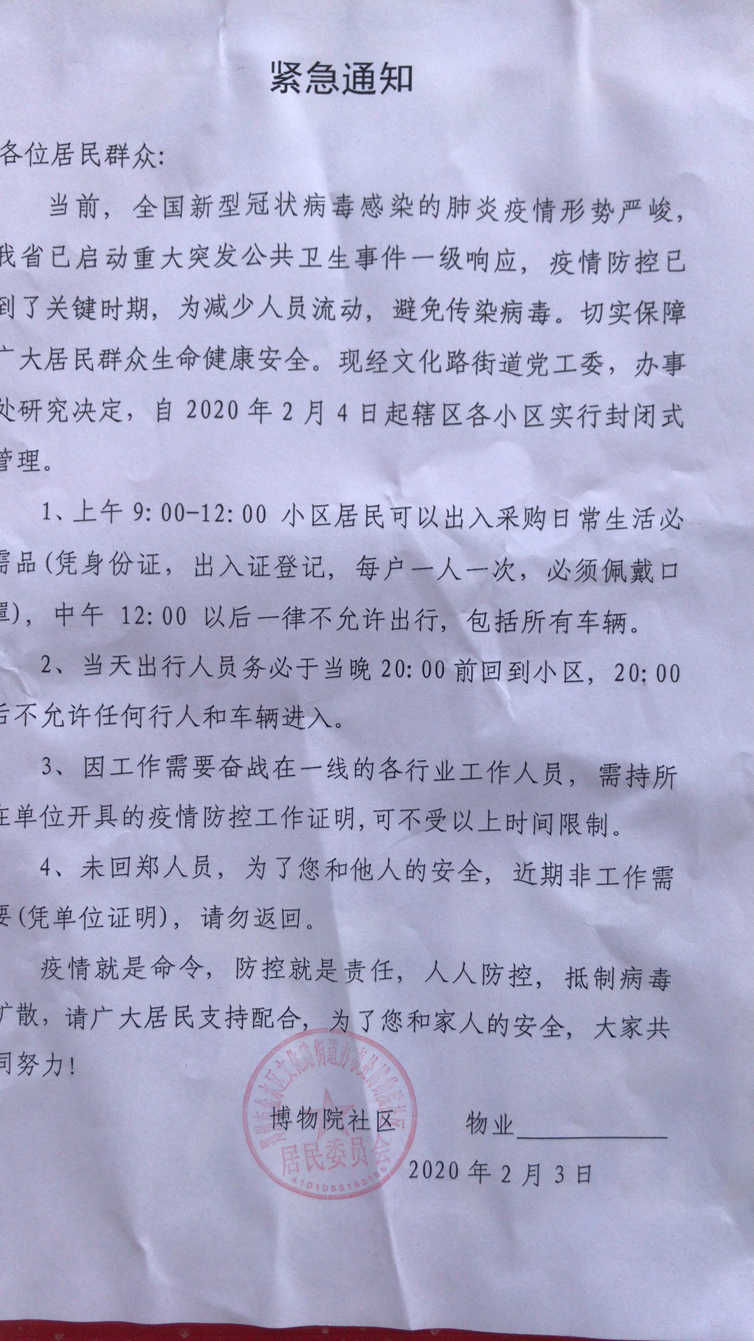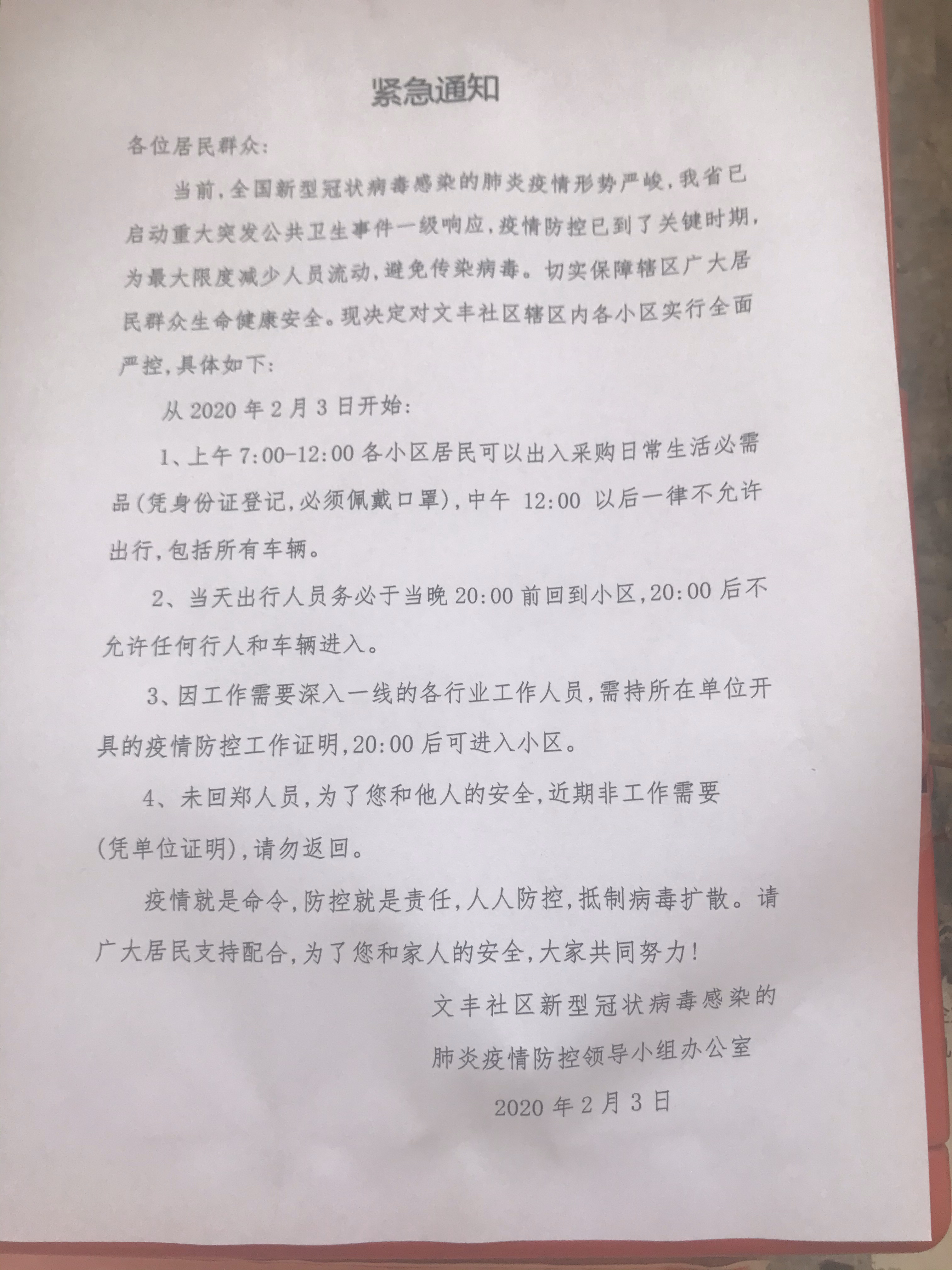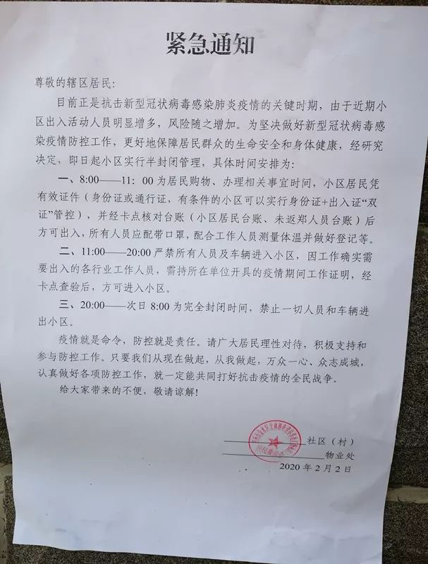 贴在门口的“紧急通知”解释了这个规定的原由:由于周边辖区已有多个小区出现新型冠状病毒感染的肺炎确诊病例,为了保障本小区业主安全,做好辖区疫情防控,经社区、警务室和物业公司共同决定,即日起,小区实施特殊时段特殊管理,所有人员进出持身份证和小区出入证,上午9:00-12:00每个家庭选派一人采购日常必需品(必须佩戴口罩),中午12:00以后一律不允许出行,包括所有车辆;因工作需要深入一线的各行工作人员,需持所在单位开具的疫情期间工作证明,外出人员务必于当天20:00之前回家,之后锁门,谢绝任何行人和车辆进入。