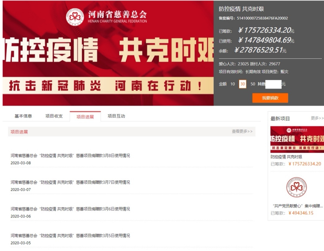 围绕当前疫情防控工作大局,省慈善总会于1月26日紧急启动“防控疫情 共克时艰”慈善项目,充分发挥自身优势,通过开展线上线下公开募捐,呼吁社会各界积极行动起来,助力打赢疫情防控阻击战,得到了社会各界的积极响应。该项目的善款收入和支出每天公示,详细情况可以随时登录河南慈善网查看。