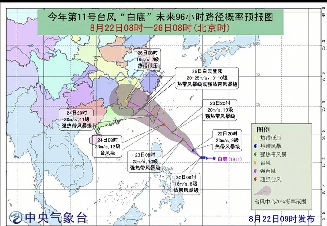 根据预计,“白鹿”将以每小时15-20公里的速度向西北方向移动,强度逐渐加强,最强可达强热带风暴级或台风级(10-12级,28-35m/s),逐渐向我国东南沿海靠近,并可能在这一带沿海登陆。