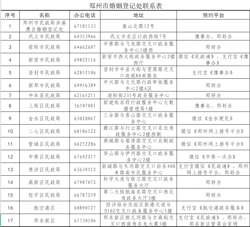 “根据我们目前了解到的最新情况,登封市婚姻登记处暂未恢复业务办理,金水区婚姻登记处12月1日恢复办理一天,今天又暂停了,与政务服务中心办事大厅涉‘阳’有关,有最新情况会及时对外发布……”12月2日,郑州市民政局社会事务处工作人员告诉记者,目前,除了这俩地方,其他都能正常办理(咨询电话附后),根据疫情防控要求,需要提前预约办理。