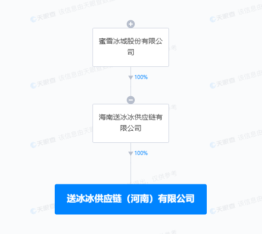 【大河财立方消息】 天眼查App显示,近日,送冰冰供应链(河南)有限公司成立,李文静任执行董事兼总经理、法定代表人,注册资本500万人民币,经营范围含供应链管理服务、普通货物仓储服务、低温仓储、非居住房地产租赁、道路货物运输等。股权全景穿透图显示,该公司由蜜雪冰城股份有限公司间接全资持股。