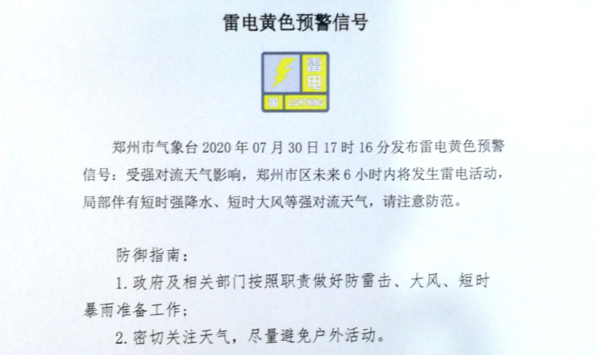 郑州市气象台7月30日17时16分发布雷电黄色预警信号:受强对流天气影响,郑州市区未来6小时内将发生雷电活动,局部伴有短时强降水、短时大风等强对流天气。