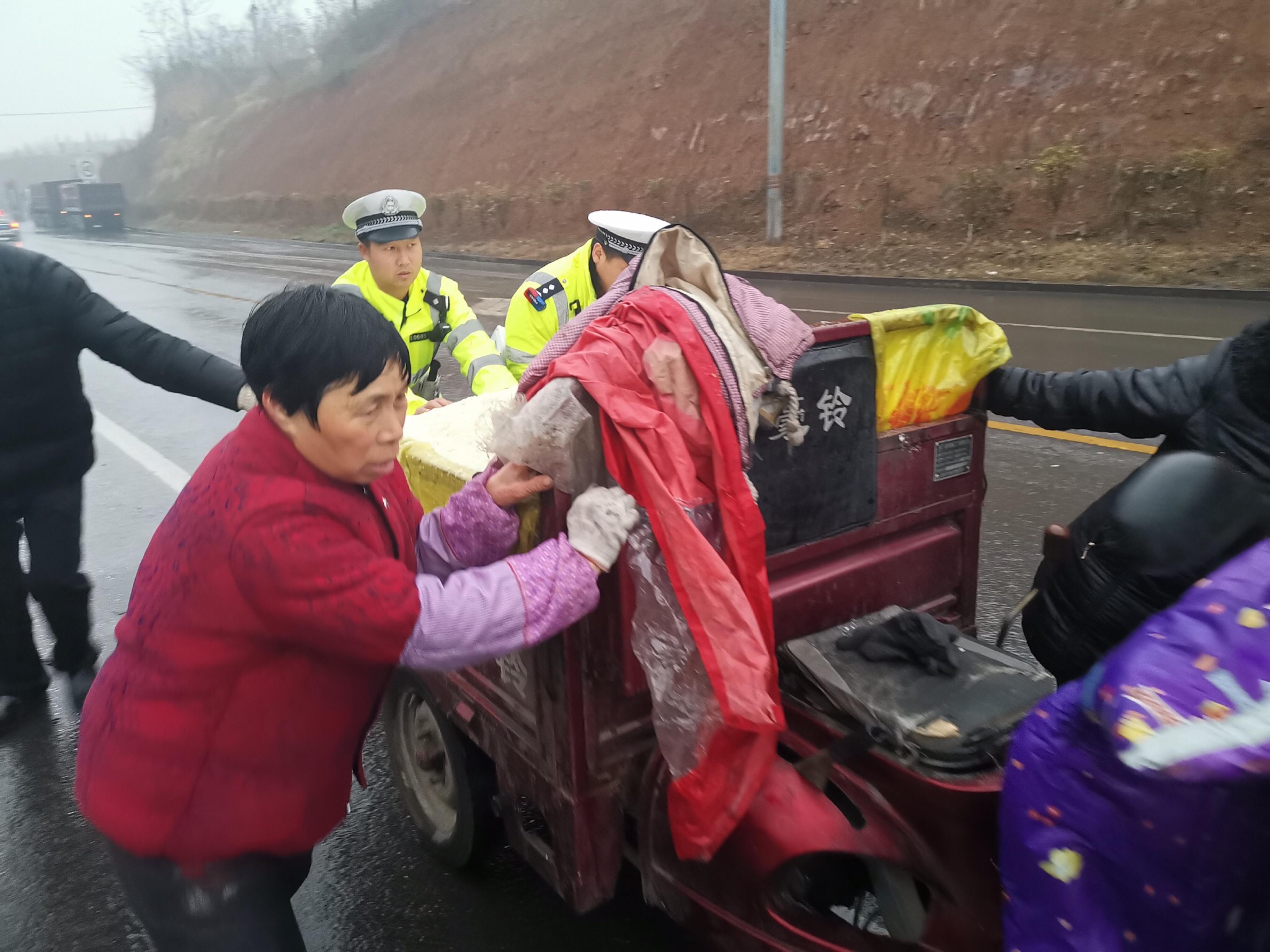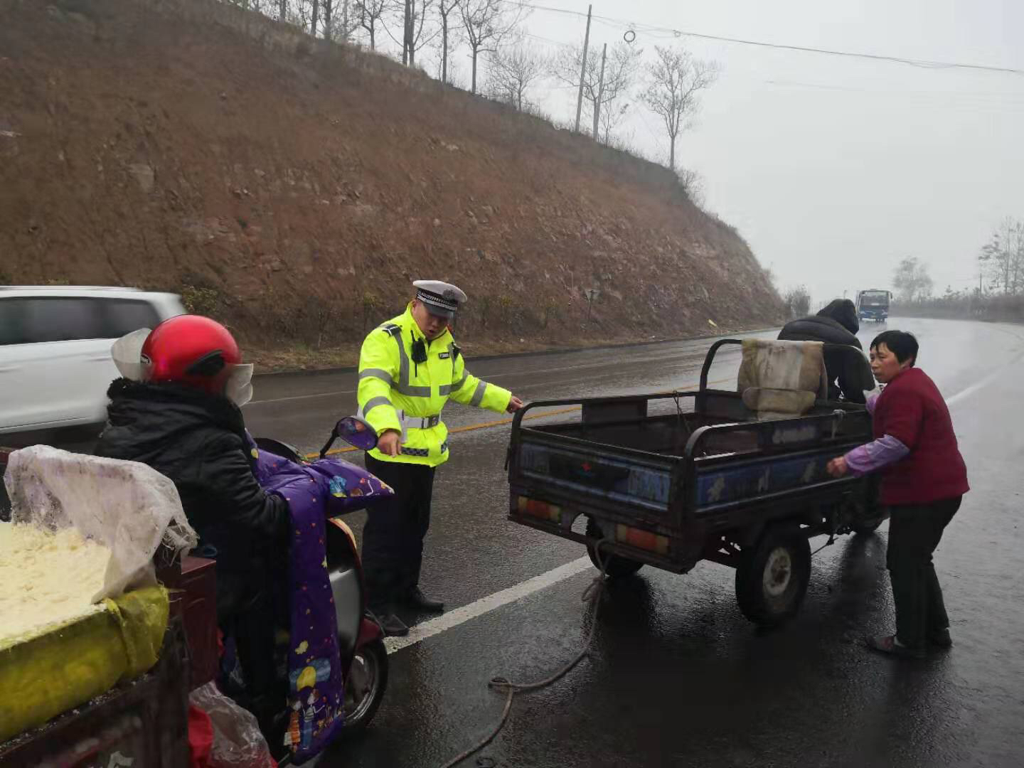雨雾中,驾车巡逻的新密交警发现一辆三轮车拖着一辆拉满货物的故障三轮车停在陡坡上,急易被雾中行走的车辆撞上。为了杜绝这一安全隐患,新密三名交警下车帮助推行了近1公里,直到坡顶安全地带后,才拖着疲惫的身体离开。