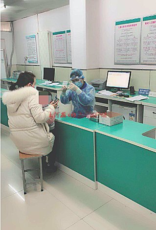 3月2日上午,在秦岭路与岗坡路交叉口北侧的社区卫生服务中心,两名工作人员正在大门口,为预约前来接种疫苗的孩子和家长测量体温。