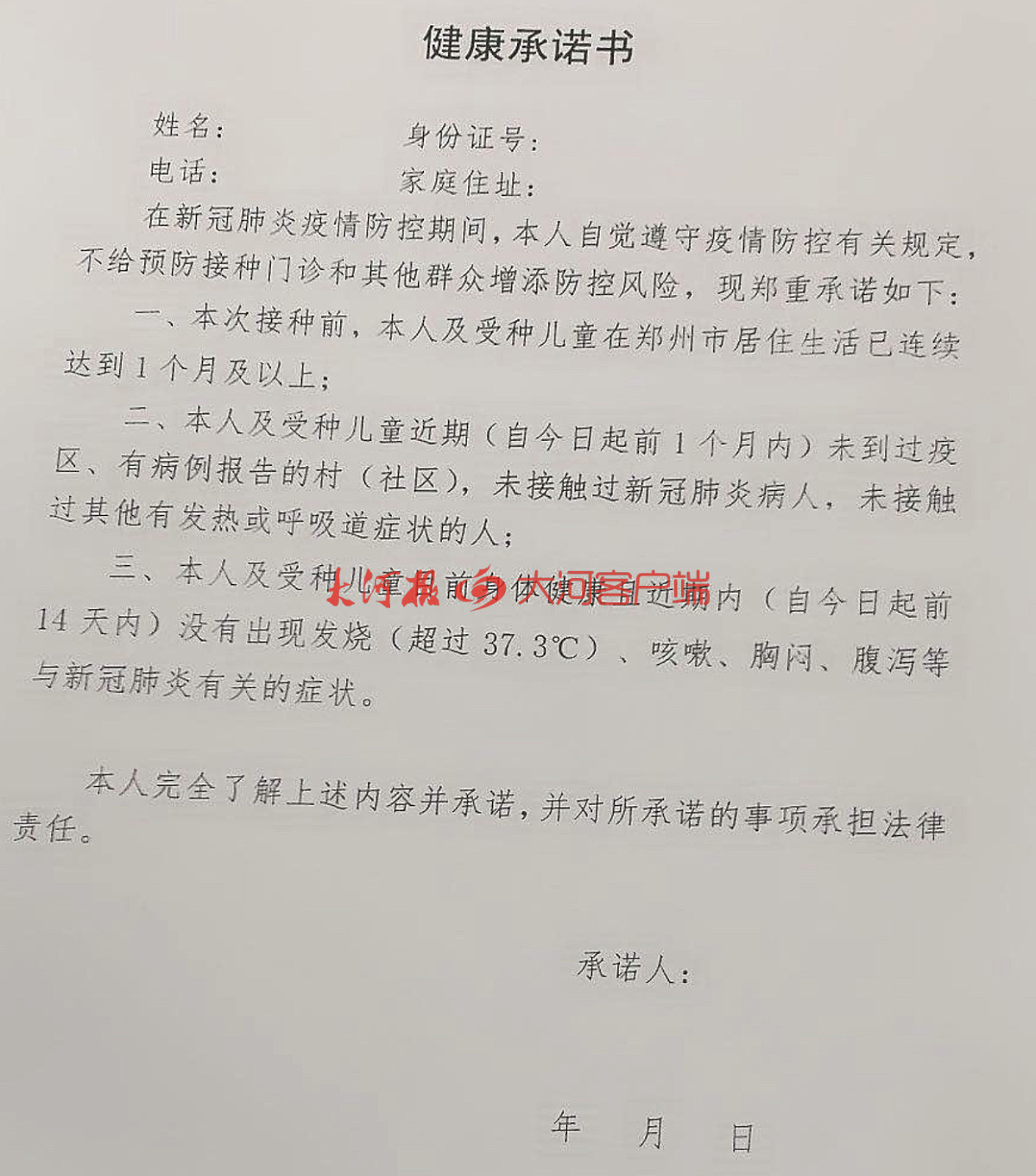 家长提供的一张《健康承诺书》上显示,预约成功的受种儿童和家长,须保证一个月内未到到疫区、有病例报告的村(社区),未接触过新冠肺炎患者,或其他有发热、呼吸道症状的人。