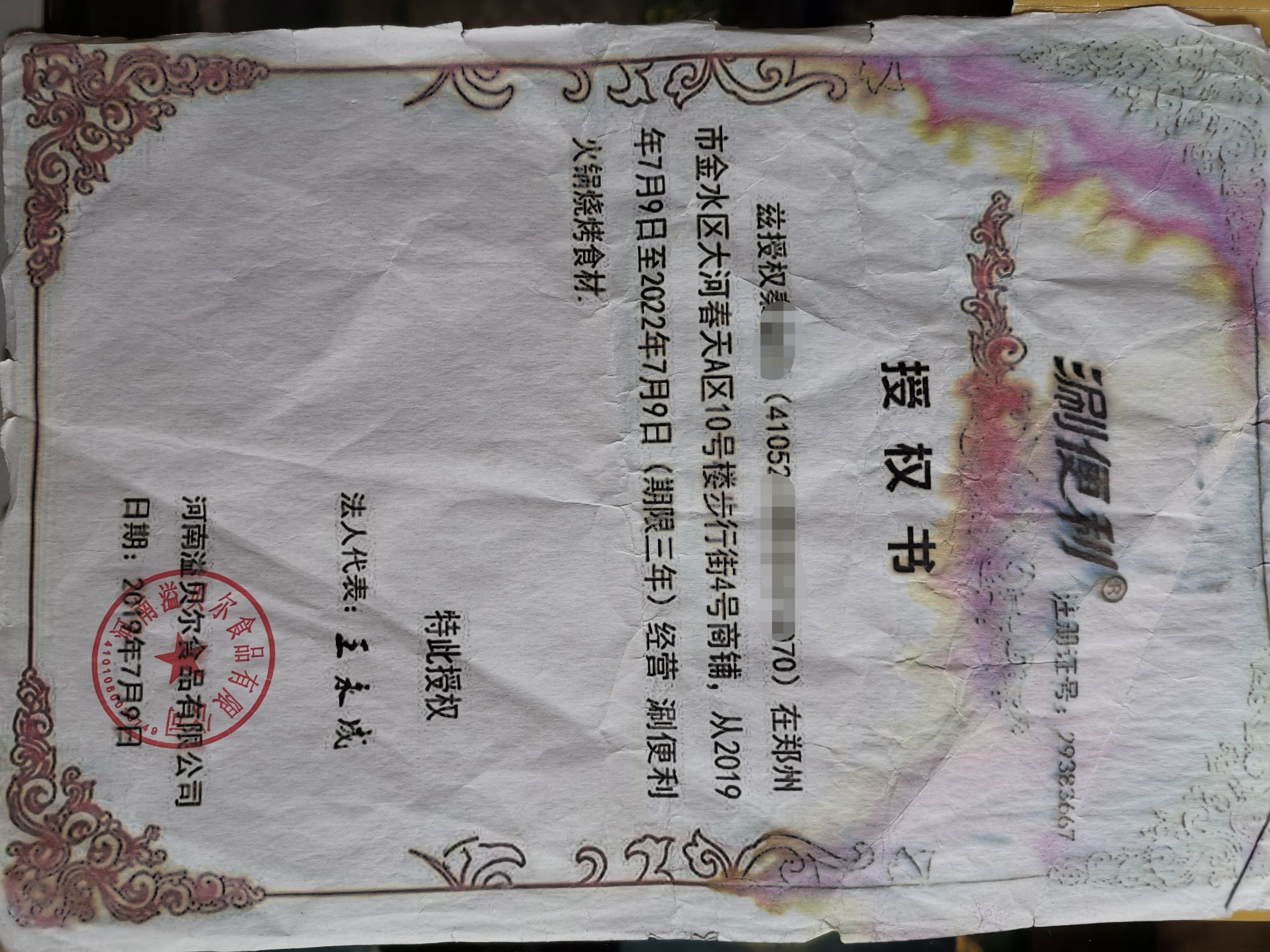 记者在秦先生店内,见到了涮便利公司对外的宣传册,其中确实明确注明了1.5公里为保护区域。其中,秦先生的授权书显示,涮便利的注册证号为29383667,授权秦先生在郑州金水区大河春天A区10号楼步行街4号商铺,从2019年7月9日至2022年7月9日(期限三年)经营“涮便利火锅烧烤食材。公司盖的公章为河南溢贝尔食品有限公司(以下简称为溢贝尔公司)。