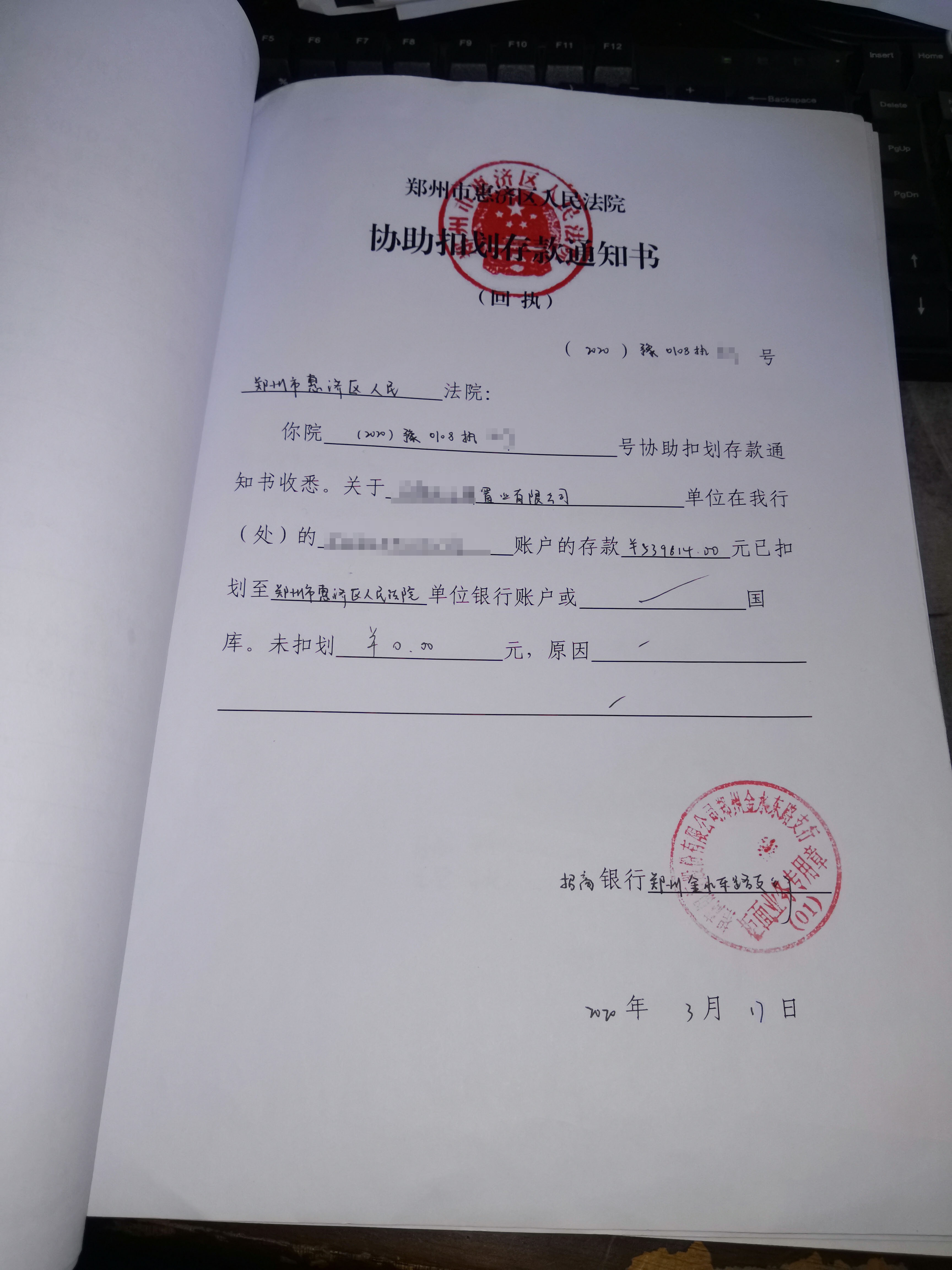 3月17日,执行法官经查询发现,被执行人被冻结的账户内有了一笔足够执行的存款,但该存款不能进行网上扣划。遂在做好安全防护措施后,立即赶往郑州市一家银行对该笔资金进行了线下扣划。考虑到疫情可能对被执行人置业公司复工复产带来的不利影响,在将执行款划扣完毕后,执行又对该公司被冻结的银行账户进行了“解冻”,为企业复工复产提供了有效助力。