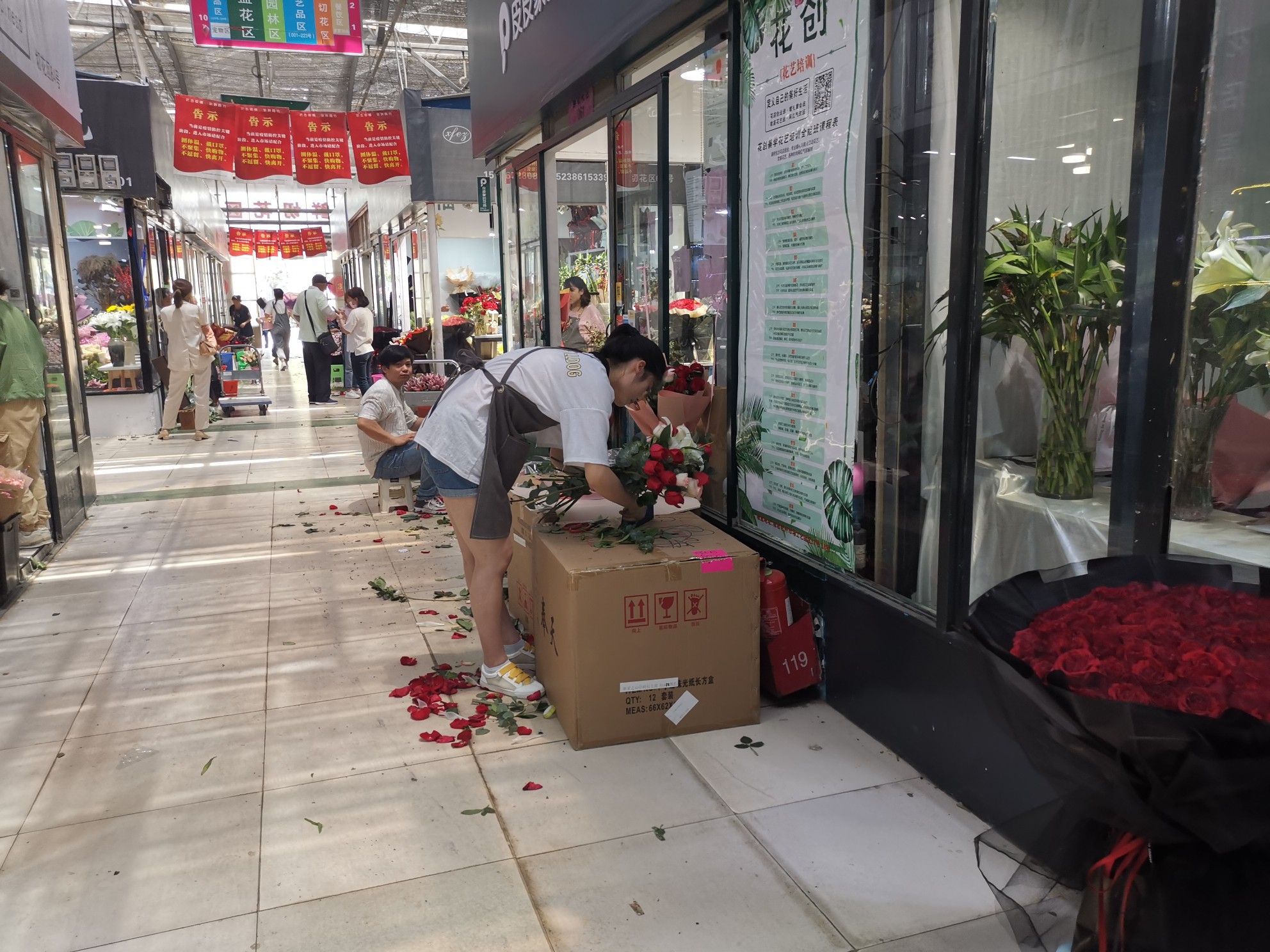 5月19日上午,大河报·大河客户端记者赶到了郑州市国基路上的陈寨花卉市场。刚走进该市场的鲜花区,记者便闻到了一股浓郁的玫瑰花香,入眼所及的每家花店内外都摆放有不少包装精美的玫瑰花束。虽然,前来市场购买玫瑰花的市民并不多,但每家花店都显得十分忙碌,其店内店外都能看到有店员在忙碌地整理玫瑰花、包装花束。其间,还不时有跑腿人员前来取花送花。