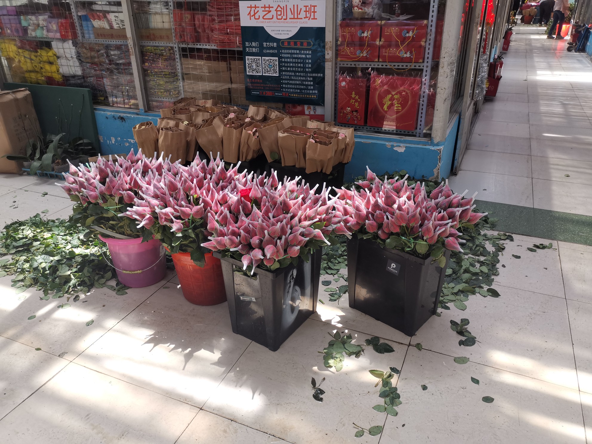 在观察中,记者看到,在该市场的卸货区、冷库门前,有不少拉着小推车的花店员工在往返运送玫瑰花,其中,不仅有红玫瑰、白玫瑰、粉玫瑰,还有黄玫瑰、紫玫瑰.....一股股玫瑰花香萦绕鼻尖。就连市场内平时带有异味的垃圾桶,也被修剪下的玫瑰花瓣与花枝染香。