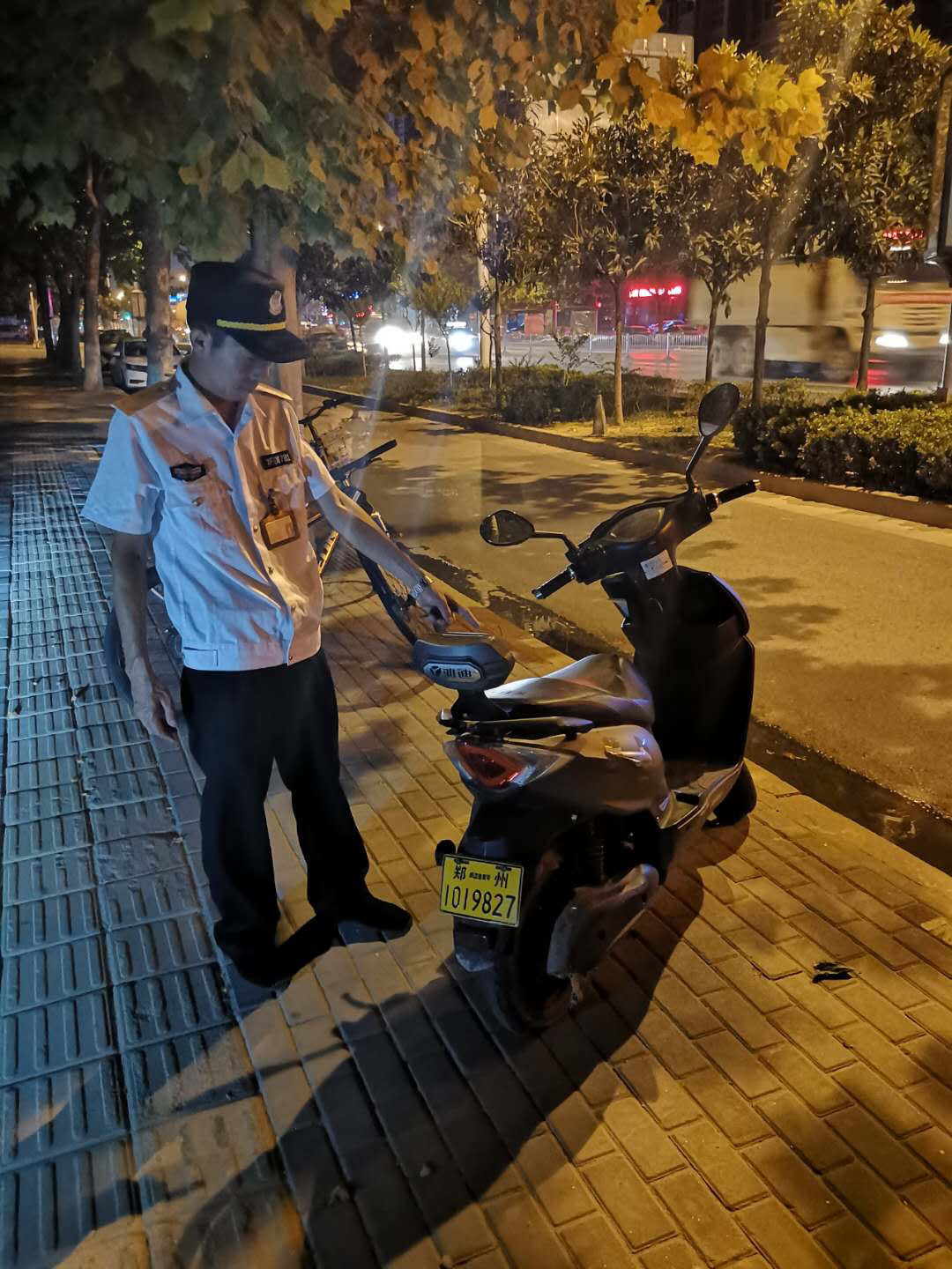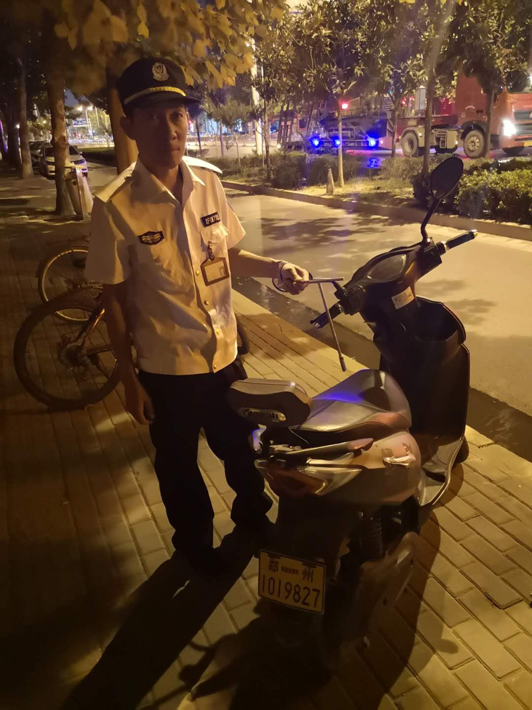 6月23日凌晨1时许,金水区丰庆路街道办事处巡防队员青中央、杨智勇二人,巡逻到三全路与香山路交叉口时,一名代驾的小哥上前求助,指着路边停放的一辆电动车说:“你们快去看看吧,刚才有个小偷在撬这辆电动车,被我喊了一声吓跑了。”队员们赶紧上前查看,发现被撬的电动车旁,扔着一把撬盗工具,电动车的车座已经被撬开,露出车座下面的电瓶。