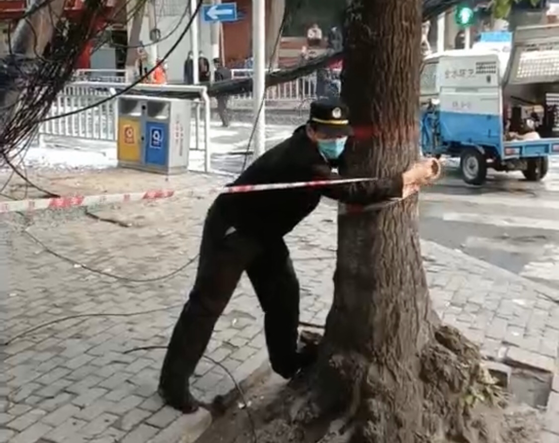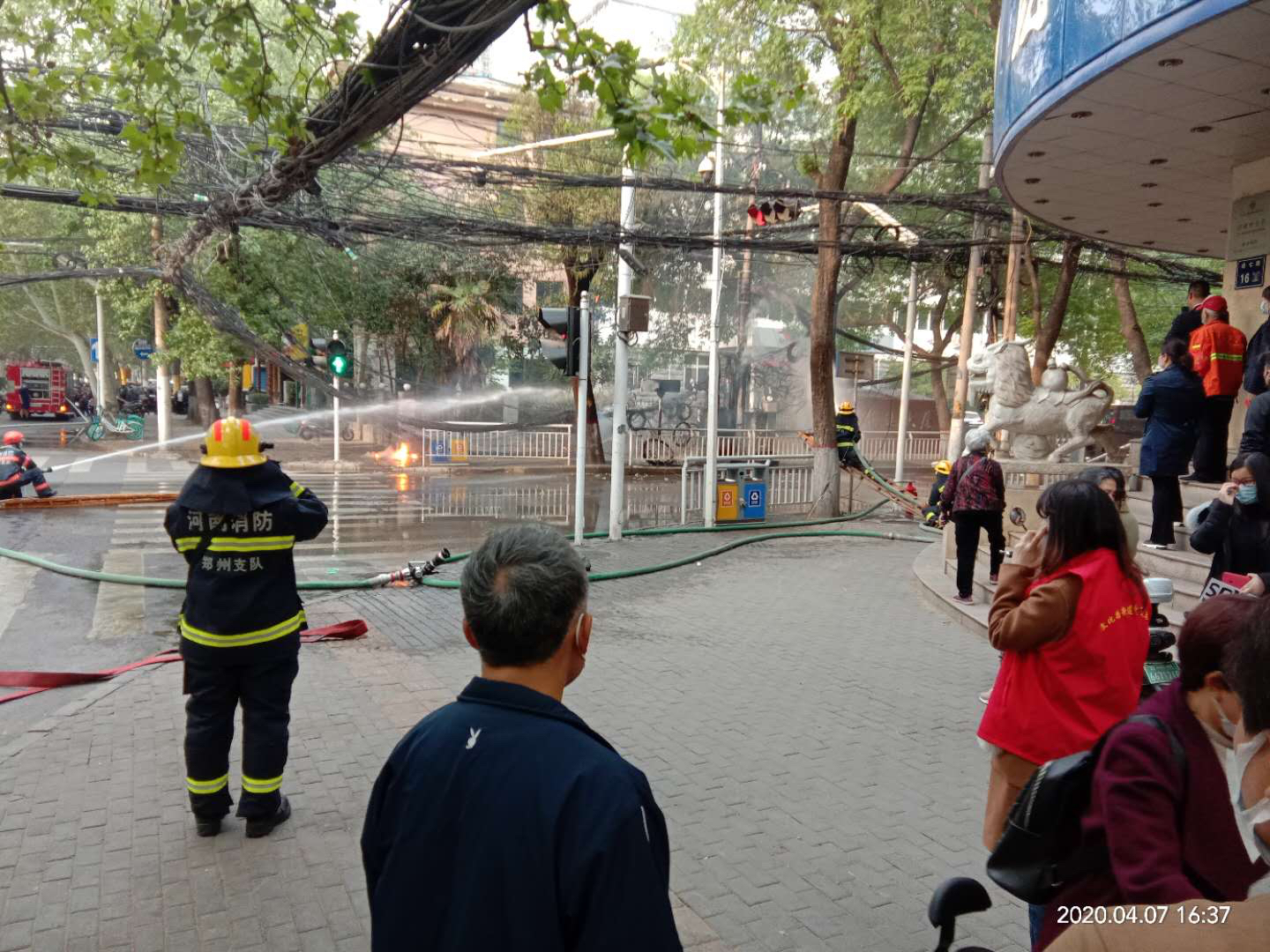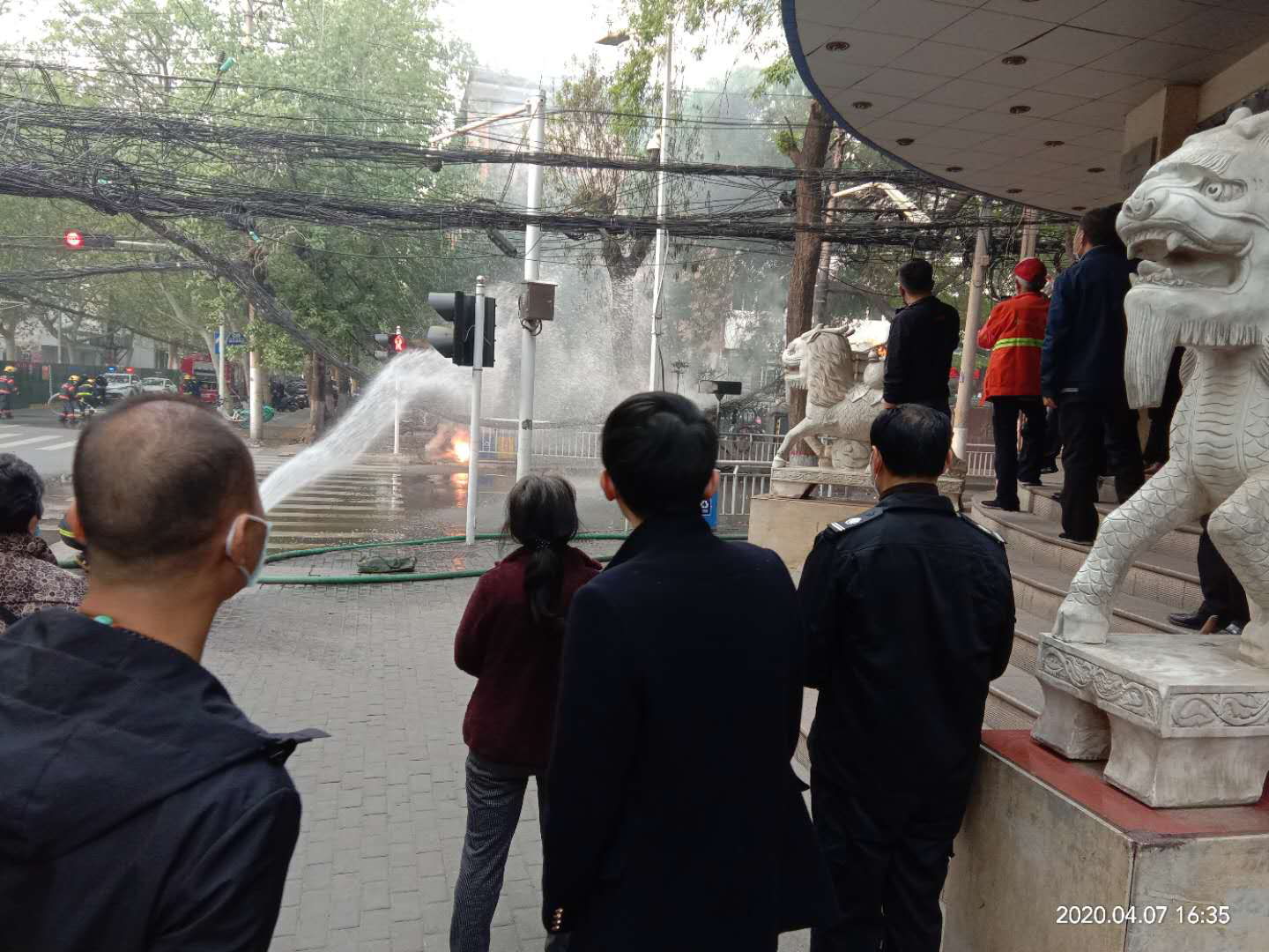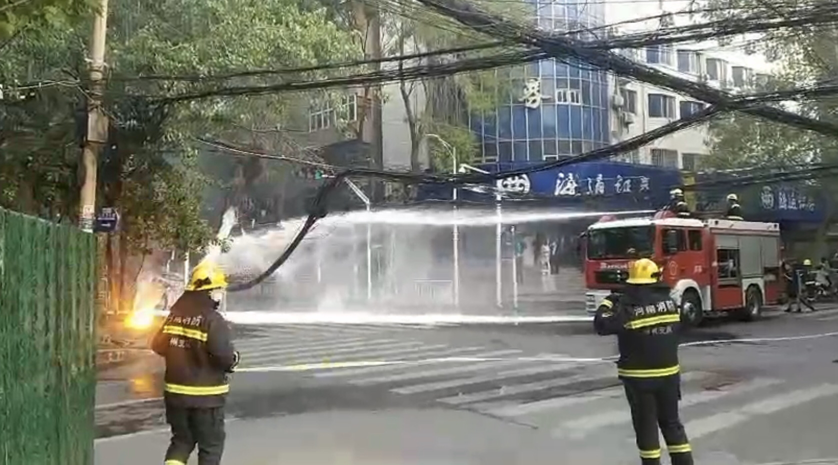 高压线起火后,将旁边的行道树烧着。被烧断的高压线落地后,将地面人行道上的地砖也击穿一个深洞。危急时候,准备去疫情防控卡点值班的金水区文化路办事处巡防队员范双文、刘同顺、郭志强三人路过此处,见高压线起火冒烟还伴随着电打火的响声,赶紧疏散过路行人和车辆,拨打119,并在现场周围拉上了警戒线,以免行人靠近后发生意外。
