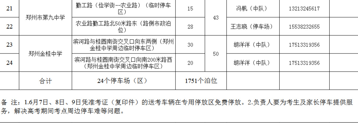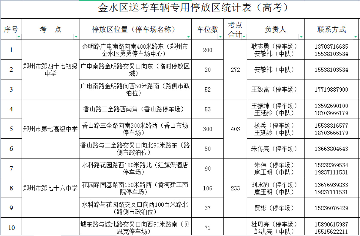 截至目前,金水区共设置24处高考期间送考车辆专用停放区,可提供约1751个停车位。届时,送考车辆凭考生准考证(或准考证复印件)、绿丝带或其他有效证明即可在停放区免费停放。