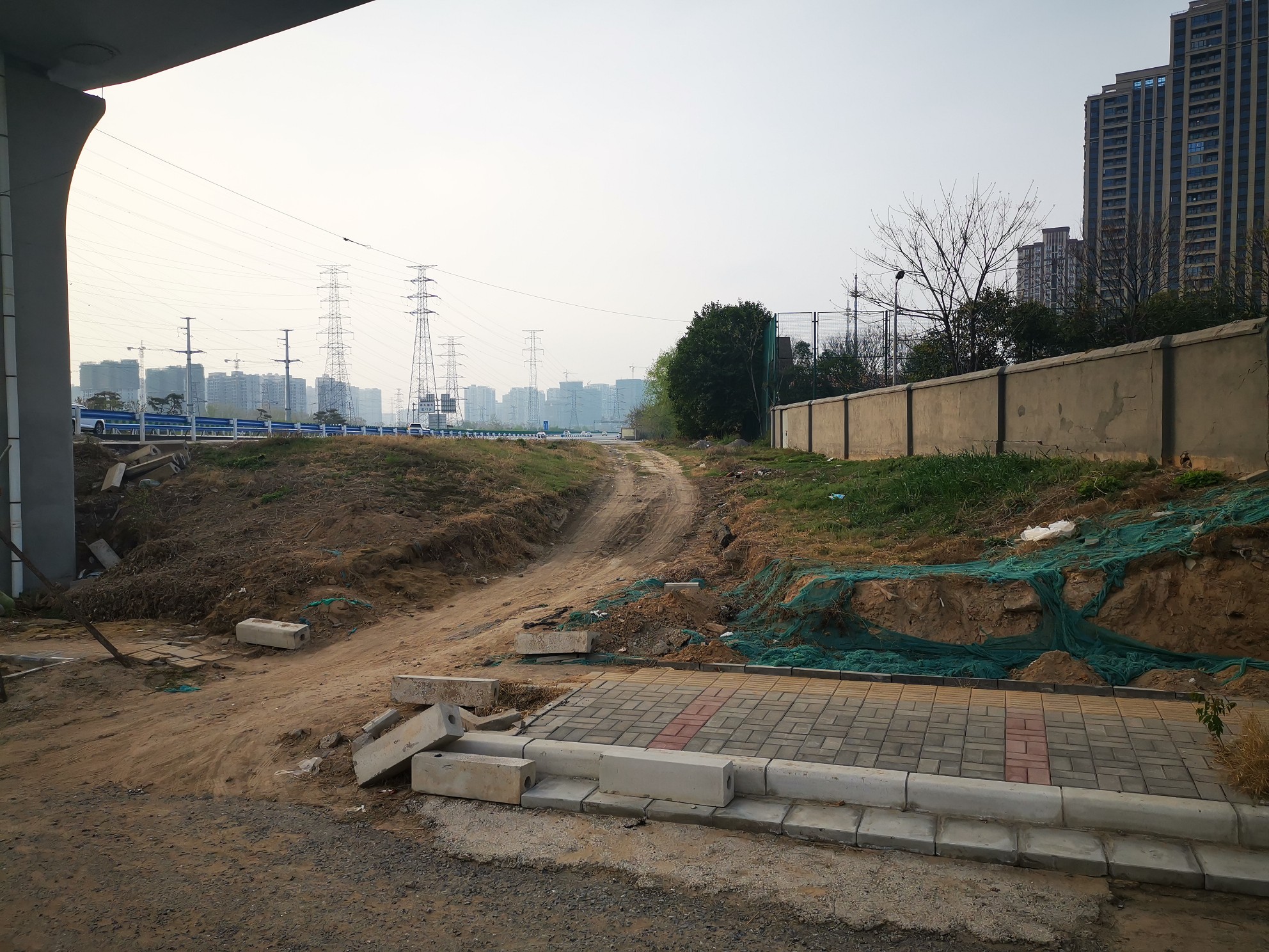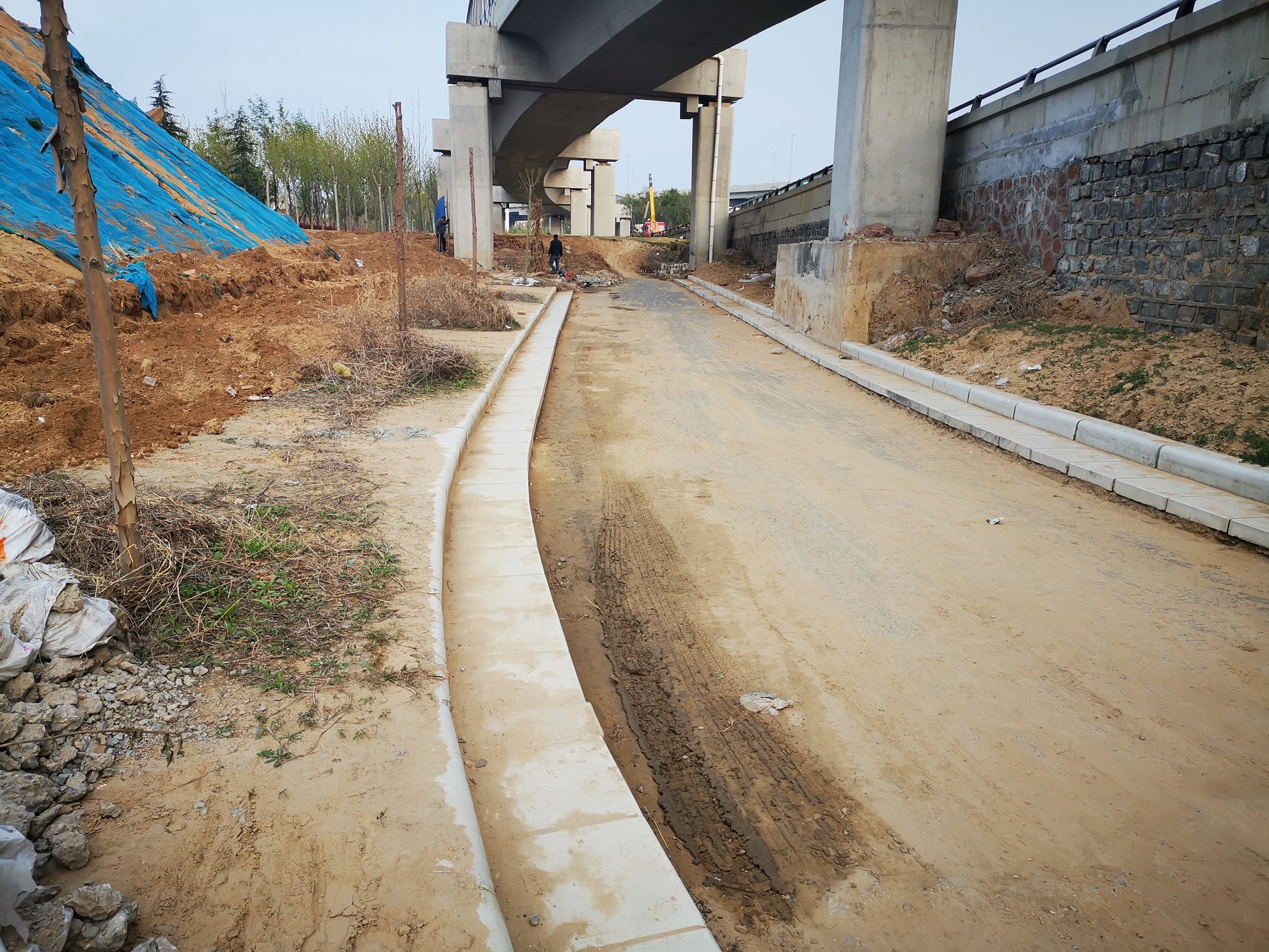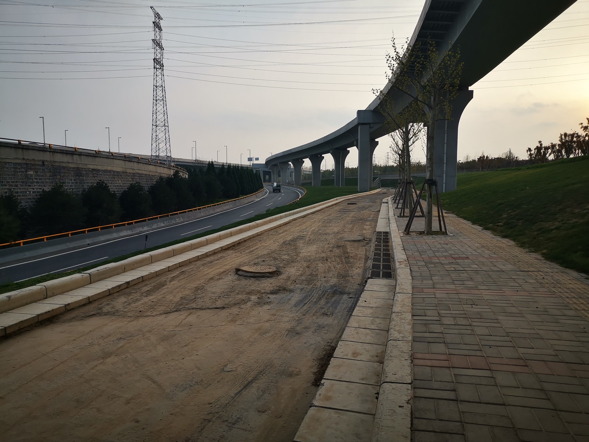 3月30日,记者在该未修通匝道口发现,围挡四周的草坪、绿化花草树木均已栽种完毕,从围挡上方可以看到,匝道一直向西北方向延伸,路上堆着约1.5米长的水泥管道。该匝道一点都没有可以开通的迹象。